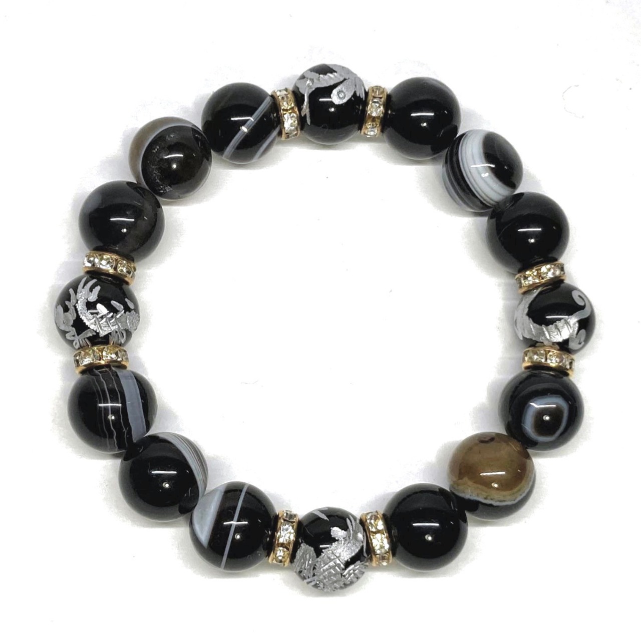 12mm 四神獣銀彫オニキス×チベットアゲート(天眼石) パワーストーン ブレスレット天然石 運気上昇 金運 ギャンブル運 お守り (ゴールド)メンズ・レディース 男性・女性 数珠ブレス 開運 ☆ | パワーストーン 天然石 Kinari&Co.