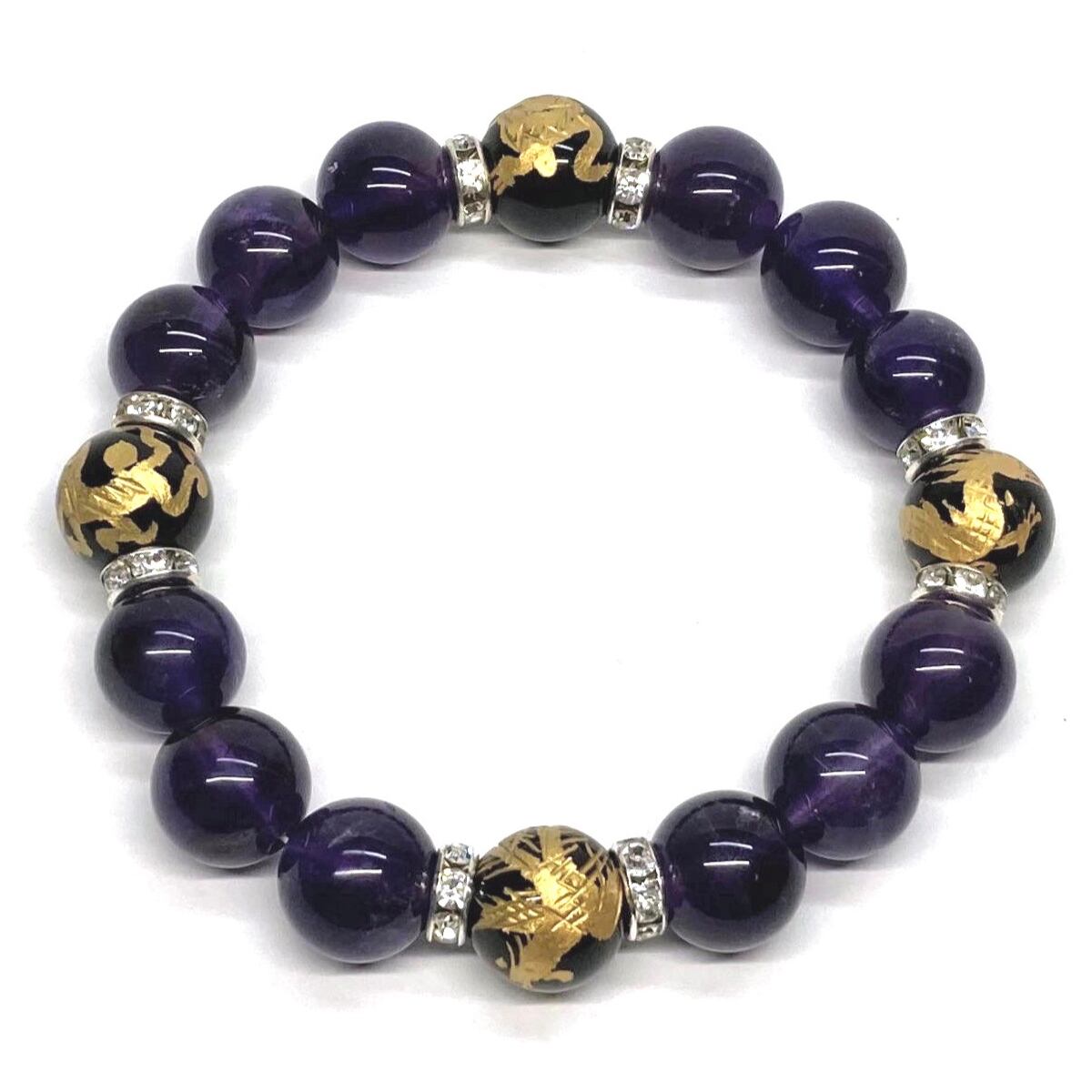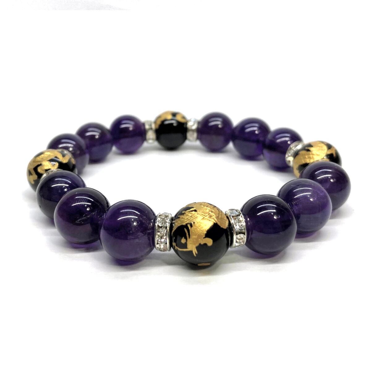 ご覧頂いているブレスレットは、四神獣金彫オニキスとアメジストを組み合わせたブレスレット。守り神である四神とパワーストーンの組み合わせで運気の流れを引き寄せる強運ブレスレットです。シンプルなデザインで男女問わず、年齢問わずご使用頂けるデザインなっております。シンプルなデザインは日常のアクセントとして、仕事やビジネスカジュアル、パーティーや特別なイベントなど様々なシーン活用できます。また、ちょっと贈り物にも最適なブレスレットになっております。四神獣を身につけて厄災から身を守り、多くの運気を呼び込まれてください。