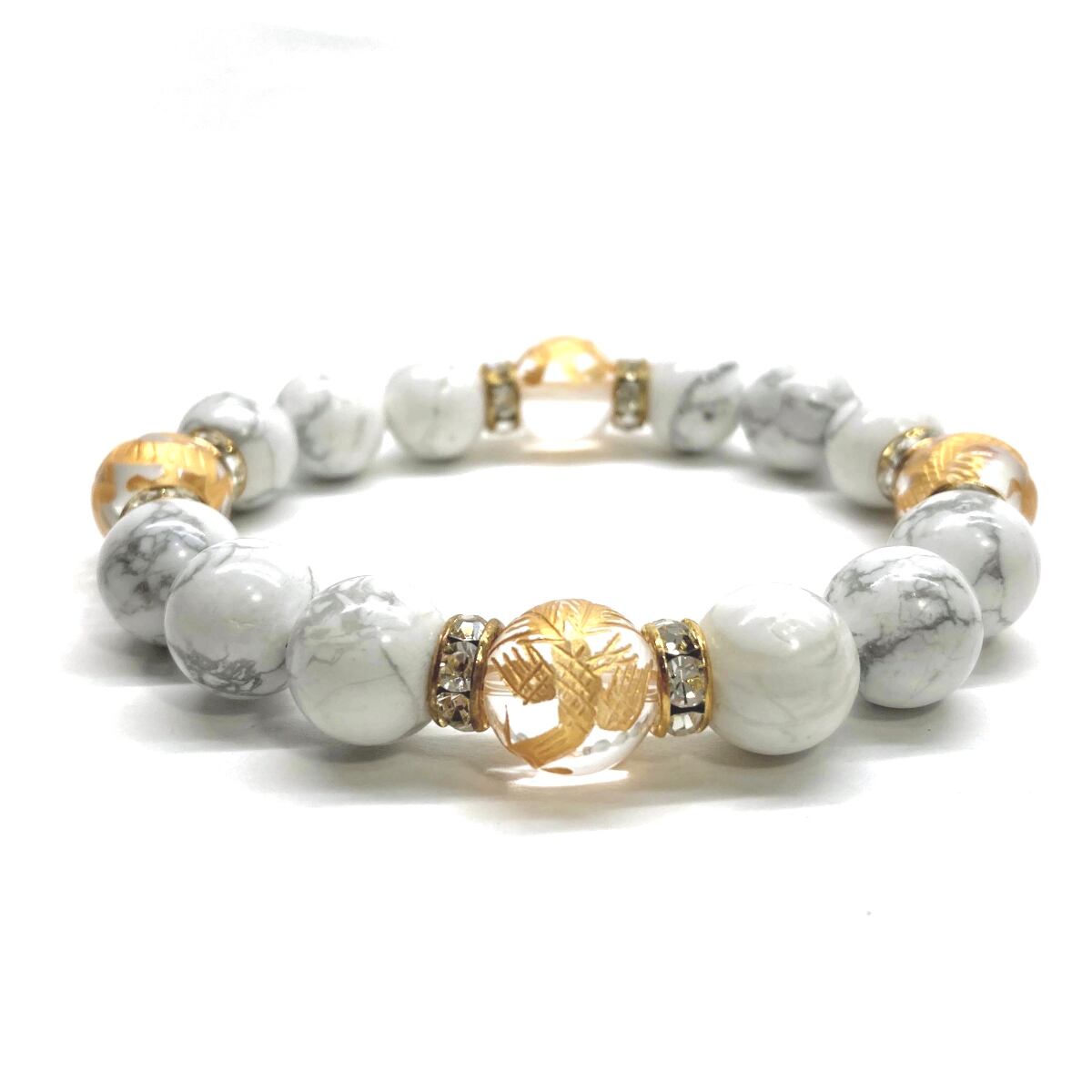 ご覧頂いているブレスレットは、四神獣金彫水晶とハウライトを組み合わせたブレスレット。守り神である四神とパワーストーンの組み合わせで運気の流れを引き寄せる強運ブレスレットです。シンプルなデザインで男女問わず、年齢問わずご使用頂けるデザインなっております。シンプルなデザインは日常のアクセントとして、仕事やビジネスカジュアル、パーティーや特別なイベントなど様々なシーン活用できます。また、ちょっと贈り物にも最適なブレスレットになっております。四神獣を身につけて厄災から身を守り、多くの運気を呼び込まれてください。