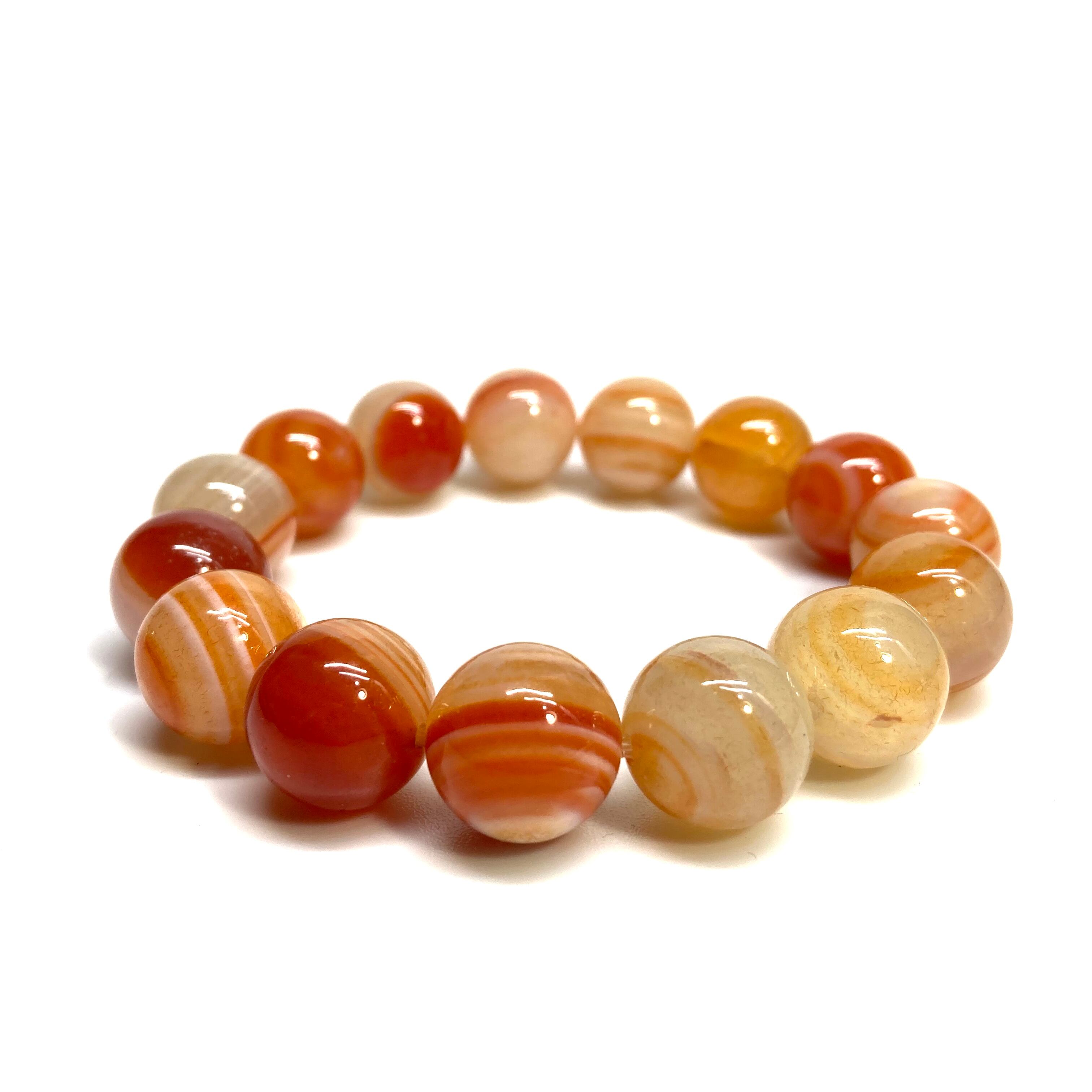 こちらは、14mm玉のカーネリアン・サードニクス(レッド天眼石)を使用した天然石ブレスレットです。シンプルなデザインですのでどんなコーディネートとも合わせ易いブレスレットです。石大きさはインパクトを与えてくれる大きさの14mm玉を使用しています。内周約17cmです。数に限りがございますので気になる方はお早めにどうぞ。