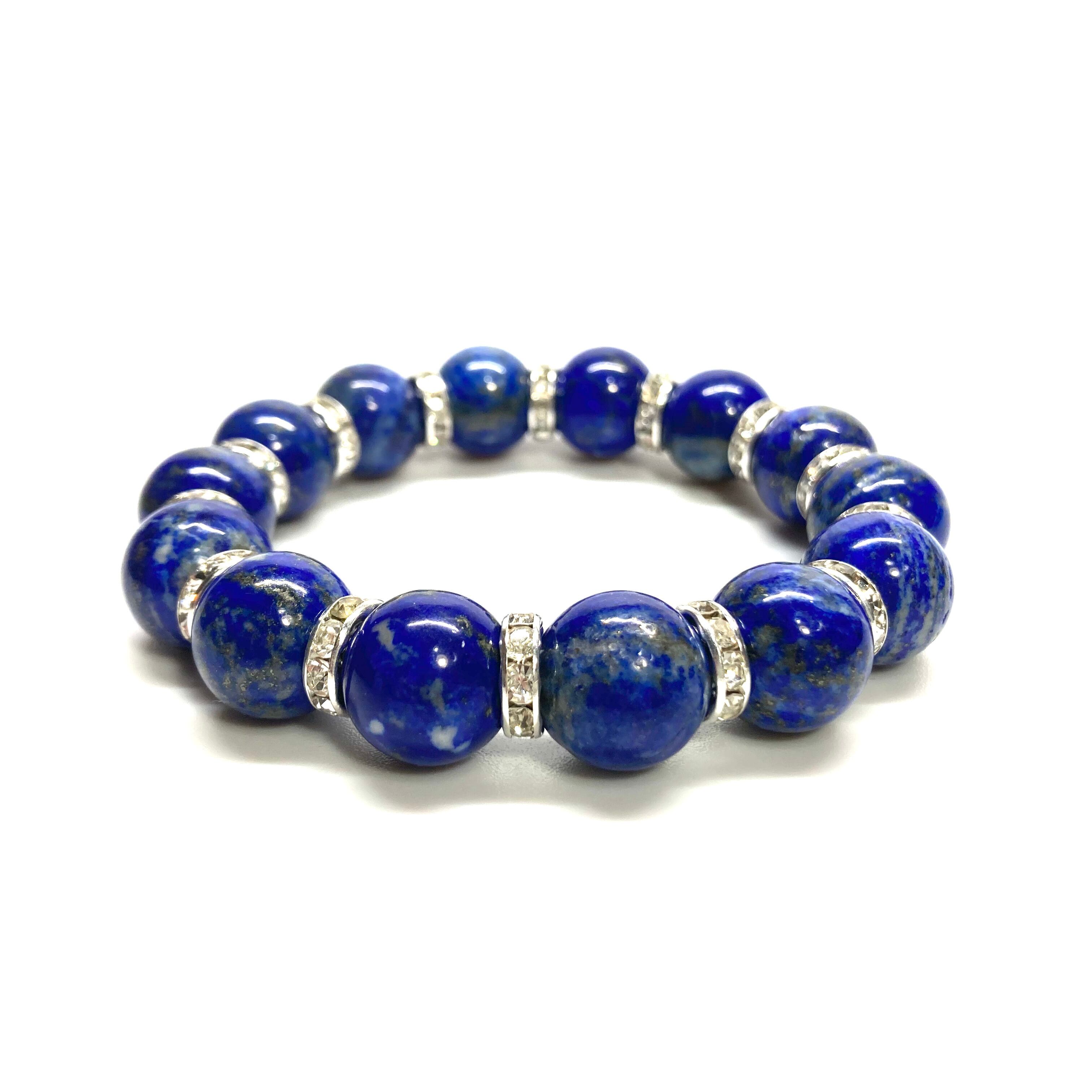 こちらは、14mm玉のラピスラズリを使用した天然石ブレスレットです。シンプルなデザインですのでどんなコーディネートとも合わせ易いブレスレットです。石との間にはロンデルを挟み高級感を演出しています。石大きさはインパクトを与えてくれる大きさの14mm玉を使用しています。内周約17cmです。数に限りがございますので気になる方はお早めにどうぞ。
