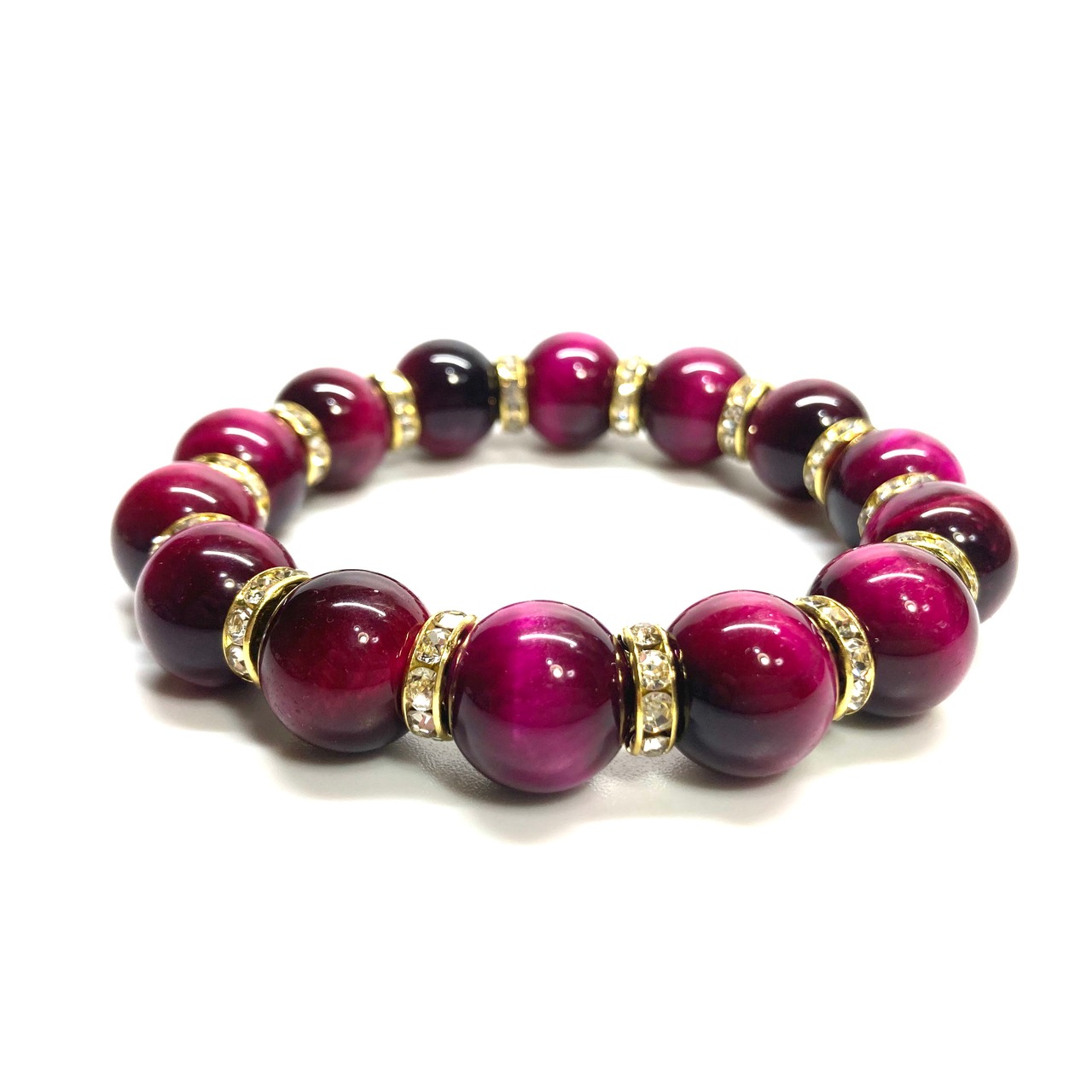 こちらは、14mm玉のピンクタイガーアイを使用したブレスレットです。シンプルなデザインですのでどんなコーディネートとも合わせ易いブレスレットです。石との間にはロンデルを挟み高級感を演出しています。石大きさはインパクトを与えてくれる大きさの14mm玉を使用しています。内周約17cmです。数に限りがございますので気になる方はお早めにどうぞ。