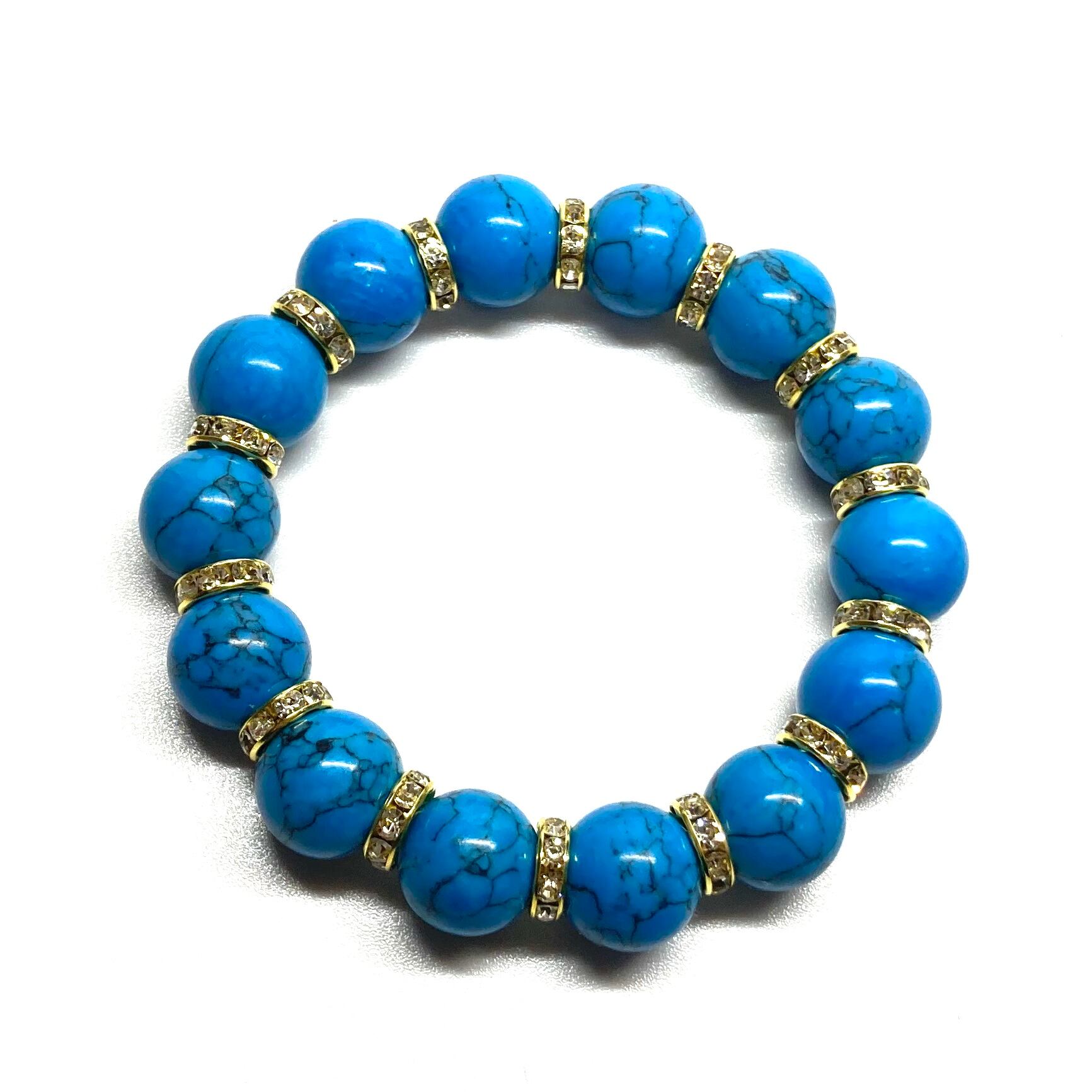 こちらは、14mm玉のターコイズを使用したブレスレットです。シンプルなデザインですのでどんなコーディネートとも合わせ易いブレスレットです。石との間にはロンデルを挟み高級感を演出しています。石大きさはインパクトを与えてくれる大きさの14mm玉を使用しています。内周約17cmです。数に限りがございますので気になる方はお早めにどうぞ。