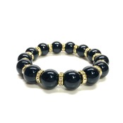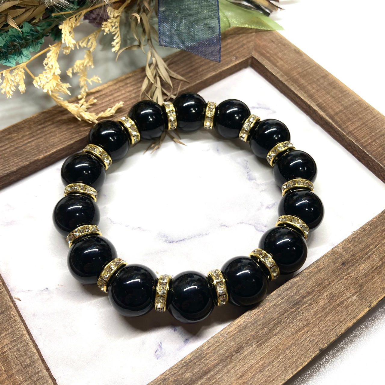 こちらは、14mm玉のオニキスを使用した天然石ブレスレットです。シンプルなデザインですのでどんなコーディネートとも合わせ易いブレスレットです。石との間にはロンデルを挟み高級感を演出しています。石大きさはインパクトを与えてくれる大きさの14mm玉を使用しています。内周約17cmです。数に限りがございますので気になる方はお早めにどうぞ。