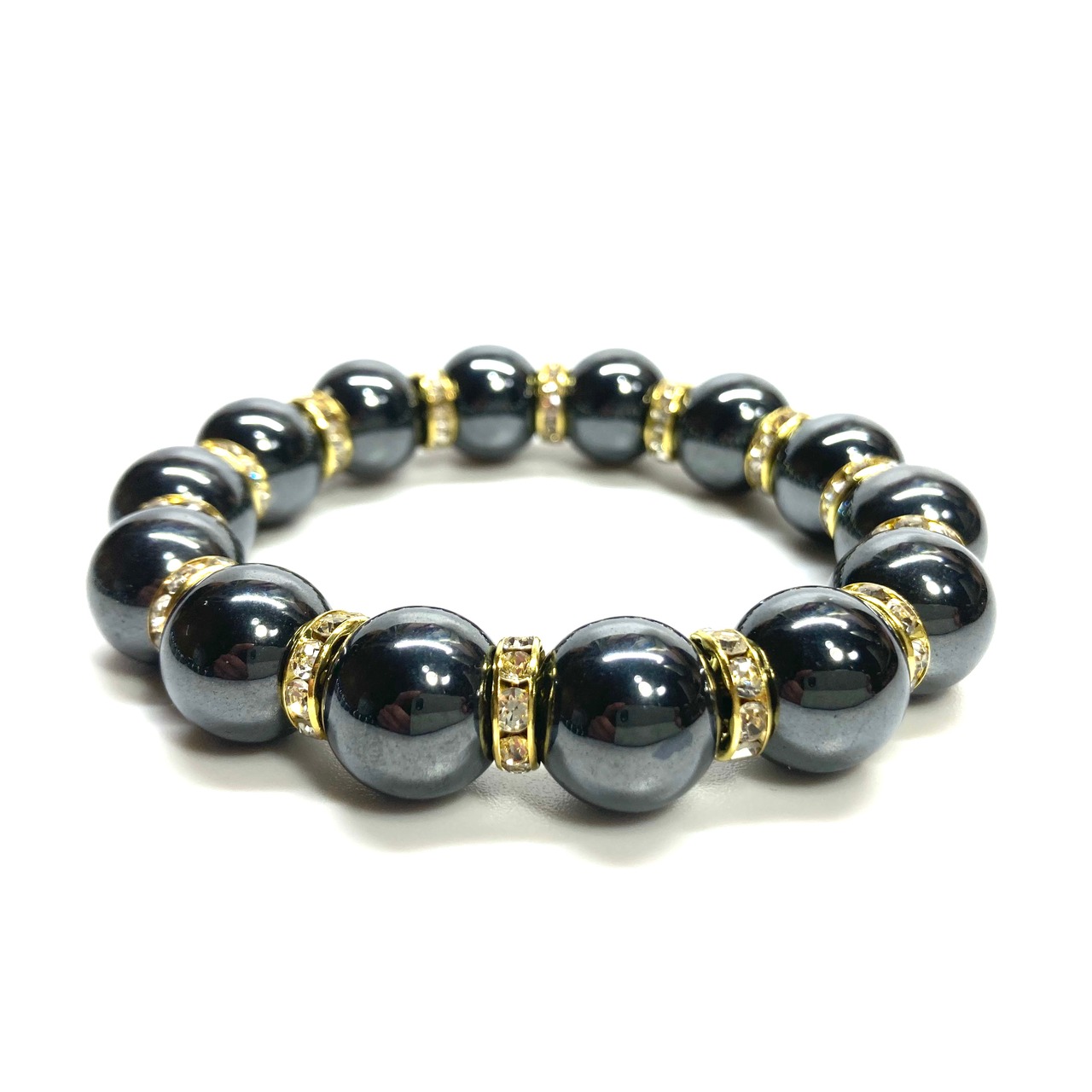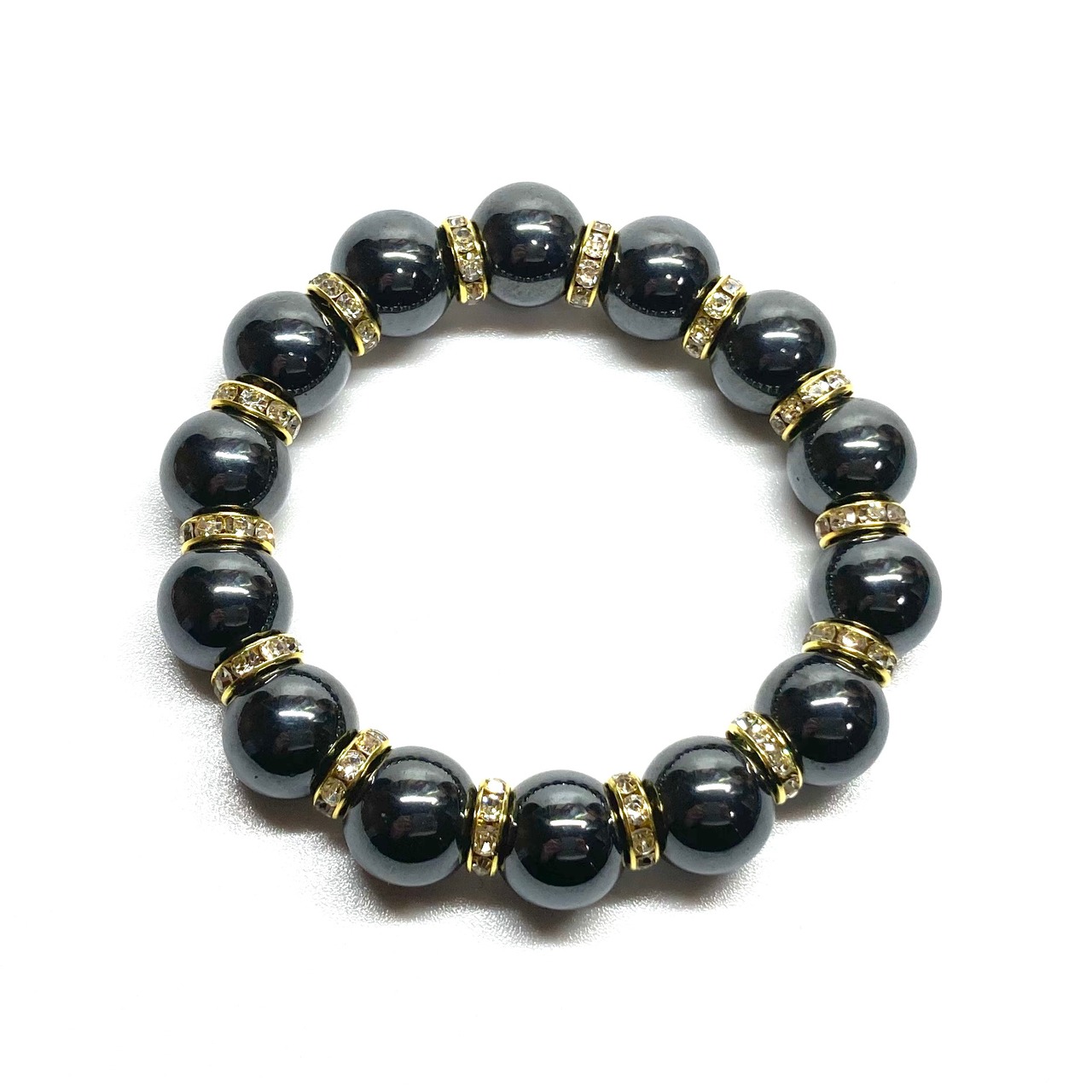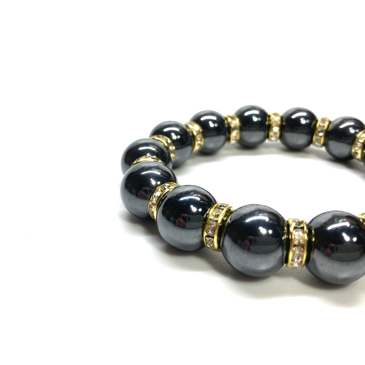 こちらは、14mm玉のヘマタイトを使用した天然石ブレスレットです。シンプルなデザインですのでどんなコーディネートとも合わせ易いブレスレットです。石との間にはロンデルを挟み高級感を演出しています。石大きさはインパクトを与えてくれる大きさの14mm玉を使用しています。内周約17cmです。数に限りがございますので気になる方はお早めにどうぞ。