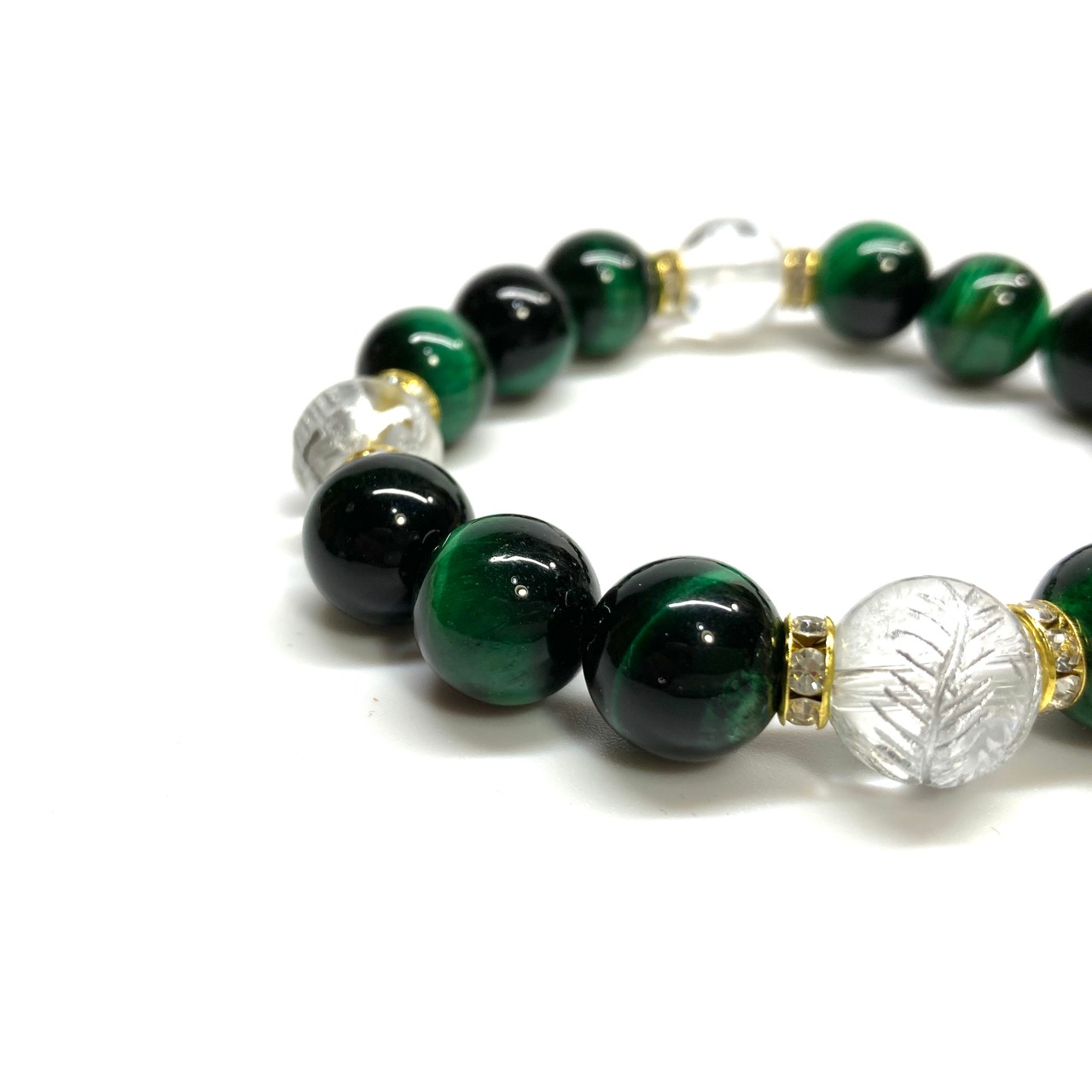 ご覧頂いているブレスレットは、四神獣銀彫水晶とグリーンタイガーアイを組み合わせたブレスレット。守り神である四神とパワーストーンの組み合わせで運気の流れを引き寄せる強運ブレスレットです。シンプルなデザインで男女問わず、年齢問わずご使用頂けるデザインなっております。シンプルなデザインは日常のアクセントとして、仕事やビジネスカジュアル、パーティーや特別なイベントなど様々なシーン活用できます。また、ちょっと贈り物にも最適なブレスレットになっております。四神獣を身につけて厄災から身を守り、多くの運気を呼び込まれてください。