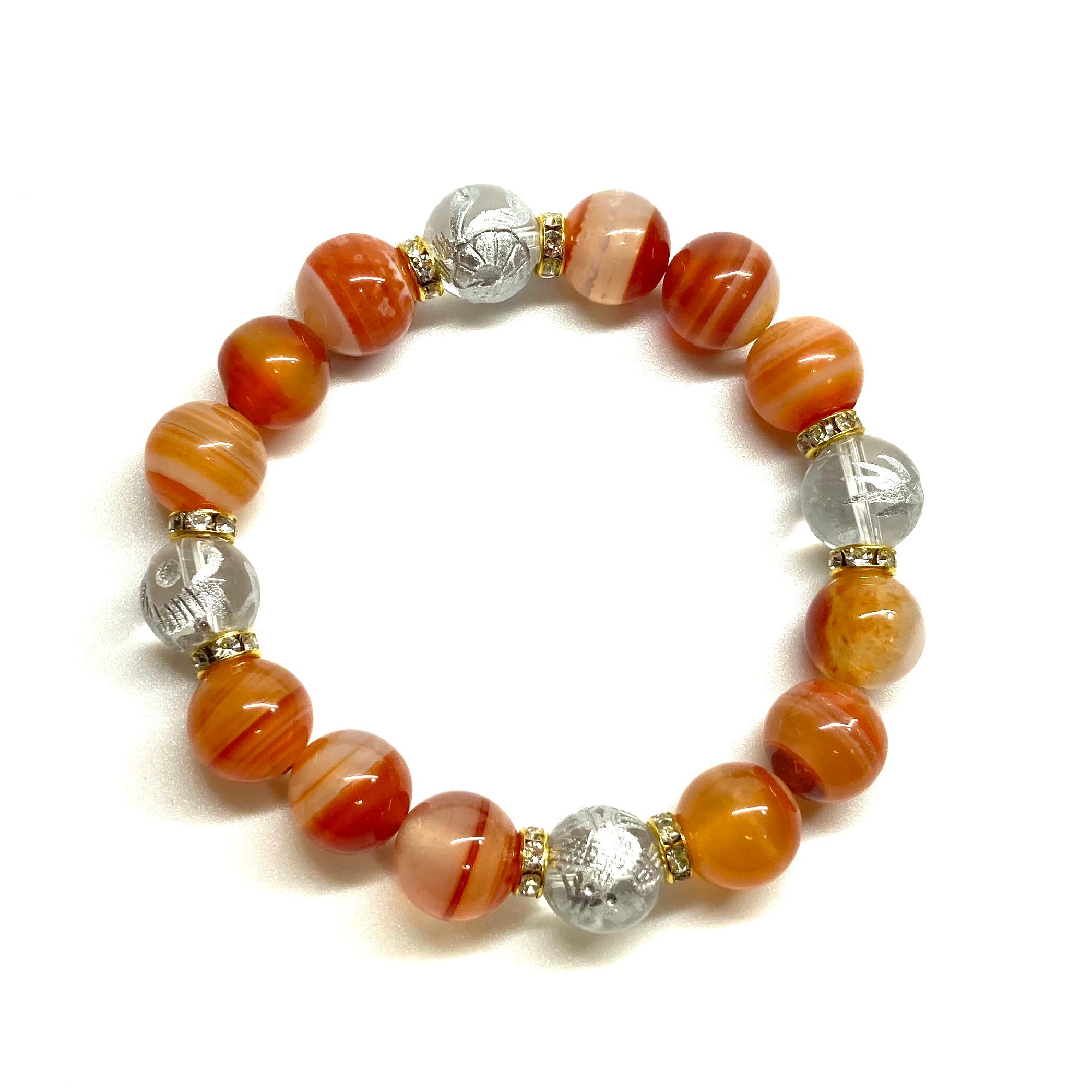 ご覧頂いているブレスレットは、四神獣銀彫水晶とカーネリアン・サードニクス(レッド天眼石)を組み合わせたブレスレット。守り神である四神とパワーストーンの組み合わせで運気の流れを引き寄せる強運ブレスレットです。シンプルなデザインで男女問わず、年齢問わずご使用頂けるデザインなっております。シンプルなデザインは日常のアクセントとして、仕事やビジネスカジュアル、パーティーや特別なイベントなど様々なシーン活用できます。また、ちょっと贈り物にも最適なブレスレットになっております。四神獣を身につけて厄災から身を守り、多くの運気を呼び込まれてください。