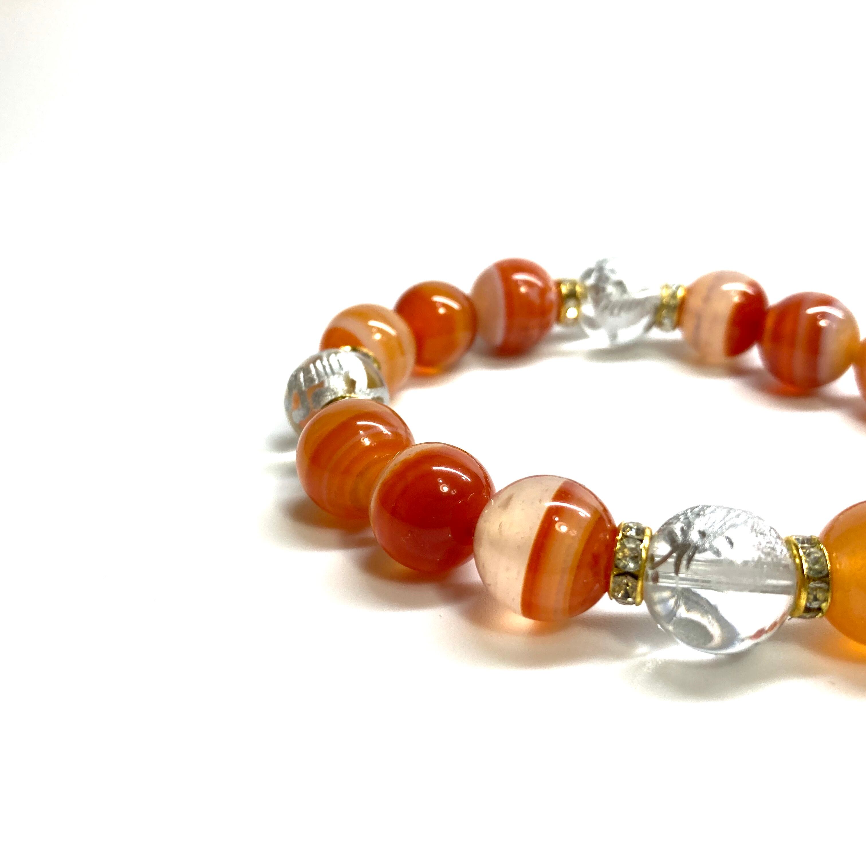 ご覧頂いているブレスレットは、四神獣銀彫水晶とカーネリアン・サードニクス(レッド天眼石)を組み合わせたブレスレット。守り神である四神とパワーストーンの組み合わせで運気の流れを引き寄せる強運ブレスレットです。シンプルなデザインで男女問わず、年齢問わずご使用頂けるデザインなっております。シンプルなデザインは日常のアクセントとして、仕事やビジネスカジュアル、パーティーや特別なイベントなど様々なシーン活用できます。また、ちょっと贈り物にも最適なブレスレットになっております。四神獣を身につけて厄災から身を守り、多くの運気を呼び込まれてください。