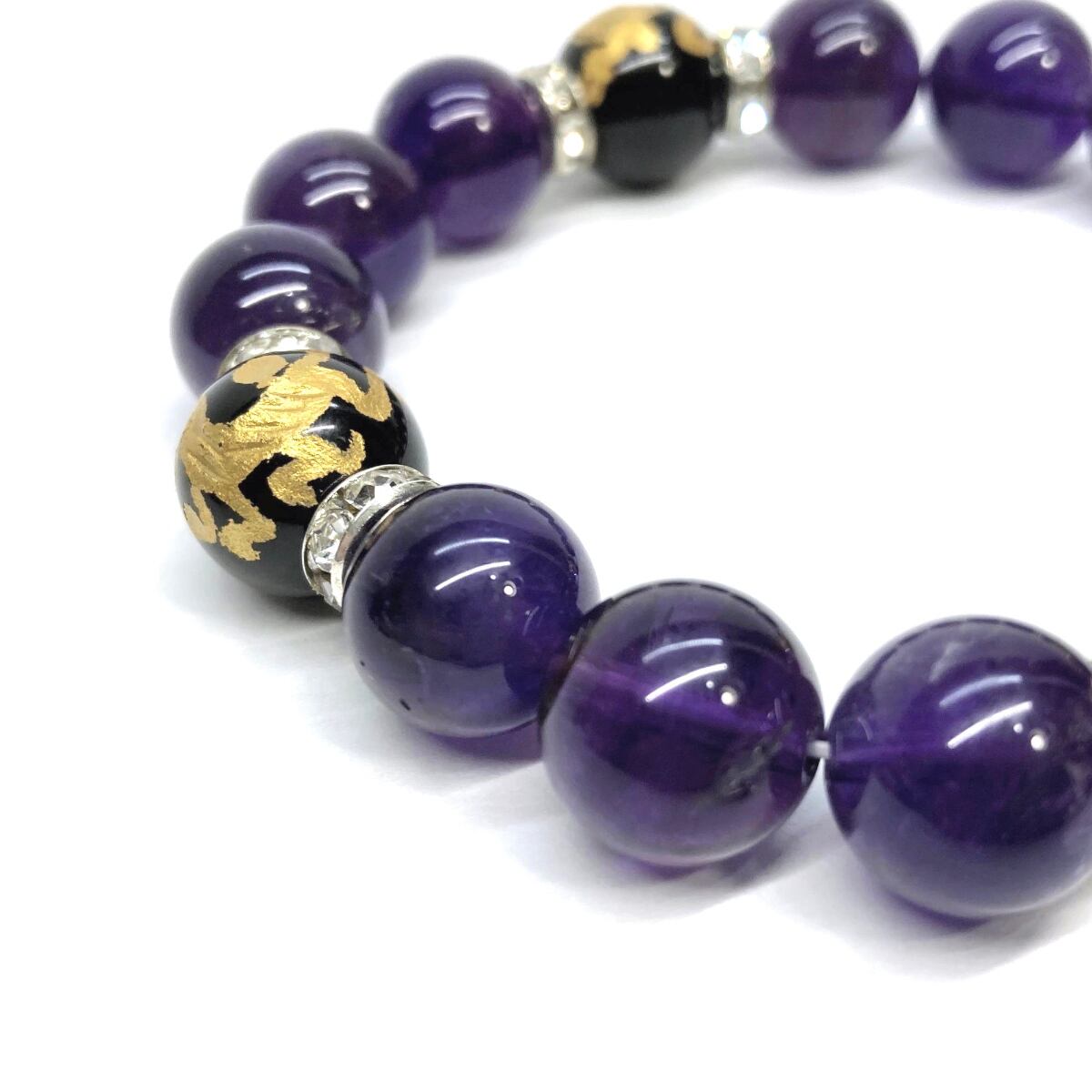 ご覧頂いているブレスレットは、四神獣金彫オニキスとアメジストを組み合わせたブレスレット。守り神である四神とパワーストーンの組み合わせで運気の流れを引き寄せる強運ブレスレットです。シンプルなデザインで男女問わず、年齢問わずご使用頂けるデザインなっております。シンプルなデザインは日常のアクセントとして、仕事やビジネスカジュアル、パーティーや特別なイベントなど様々なシーン活用できます。また、ちょっと贈り物にも最適なブレスレットになっております。四神獣を身につけて厄災から身を守り、多くの運気を呼び込まれてください。