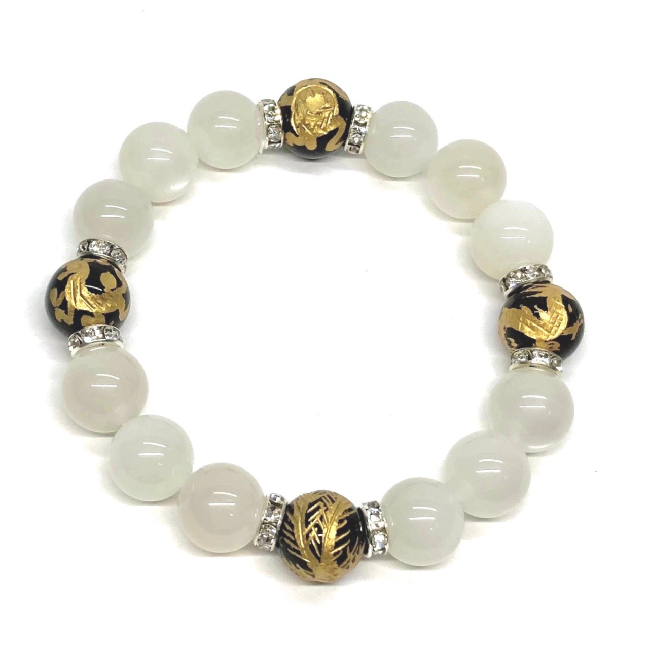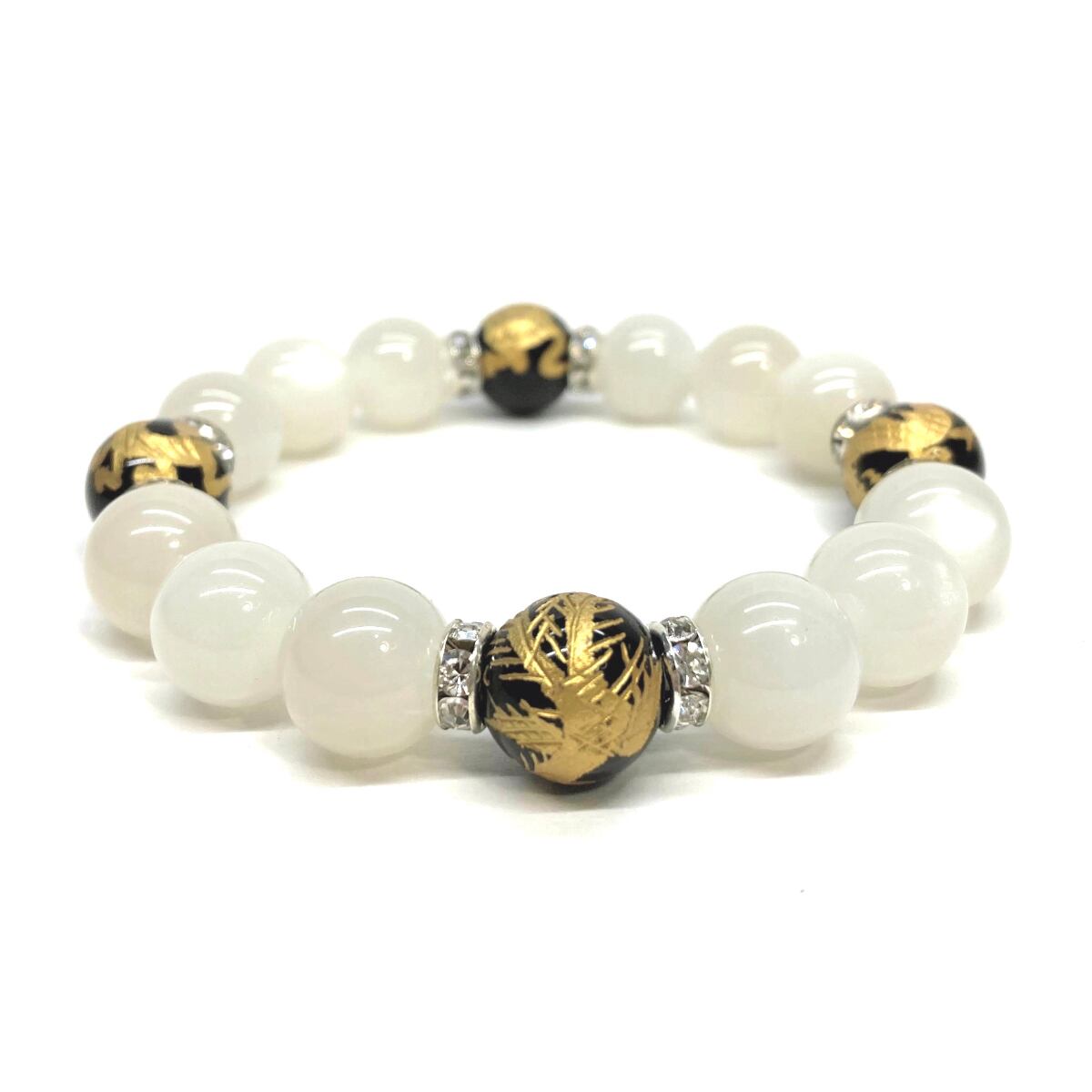 ご覧頂いているブレスレットは、四神獣金彫オニキスとムーンストーンを組み合わせたブレスレット。守り神である四神とパワーストーンの組み合わせで運気の流れを引き寄せる強運ブレスレットです。シンプルなデザインで男女問わず、年齢問わずご使用頂けるデザインなっております。シンプルなデザインは日常のアクセントとして、仕事やビジネスカジュアル、パーティーや特別なイベントなど様々なシーン活用できます。また、ちょっと贈り物にも最適なブレスレットになっております。四神獣を身につけて厄災から身を守り、多くの運気を呼び込まれてください。
