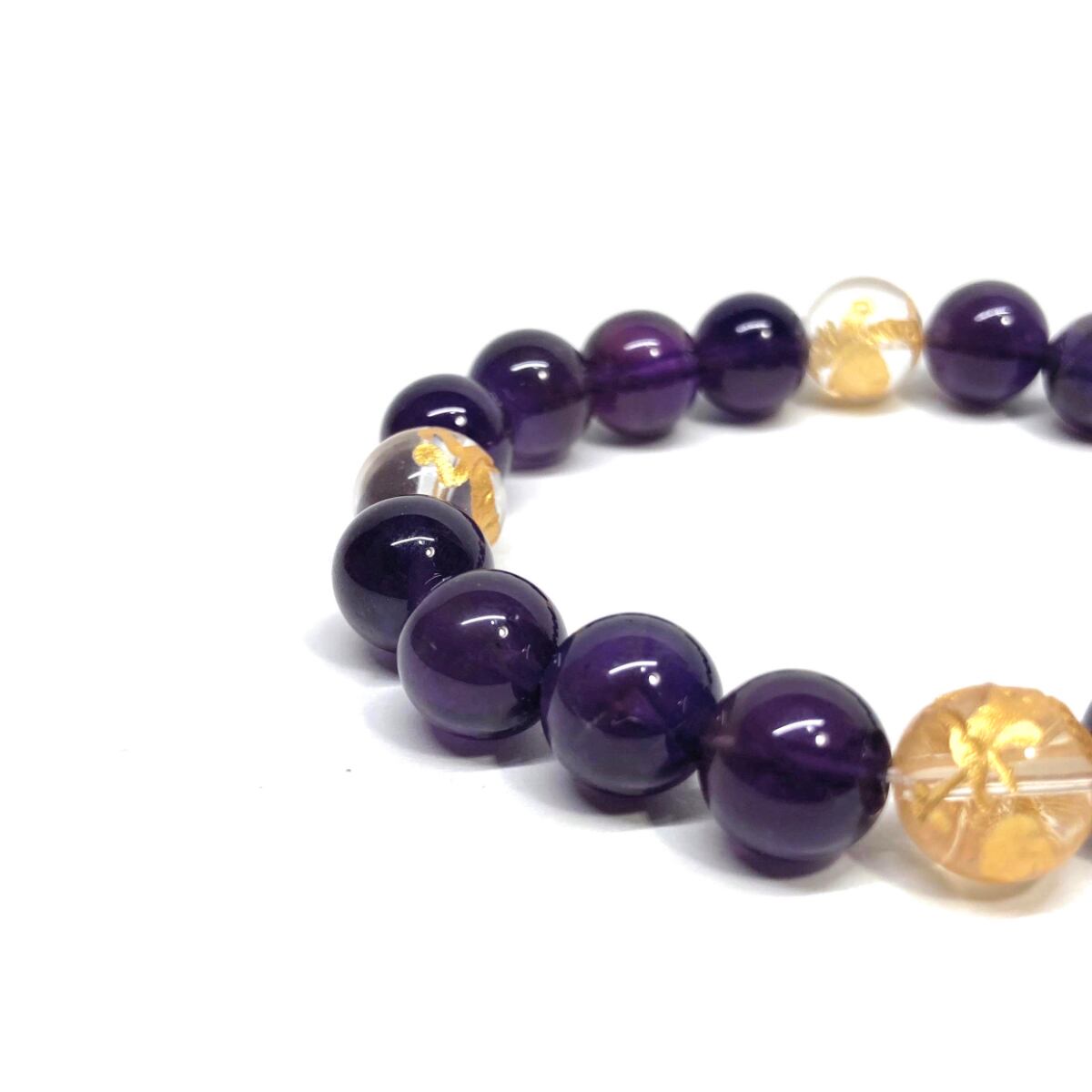ご覧頂いているブレスレットは、四神獣金彫水晶とアメジストを組み合わせたブレスレット。守り神である四神とパワーストーンの組み合わせで運気の流れを引き寄せる強運ブレスレットです。シンプルなデザインで男女問わず、年齢問わずご使用頂けるデザインなっております。シンプルなデザインは日常のアクセントとして、仕事やビジネスカジュアル、パーティーや特別なイベントなど様々なシーン活用できます。また、ちょっと贈り物にも最適なブレスレットになっております。四神獣を身につけて厄災から身を守り、多くの運気を呼び込まれてください。