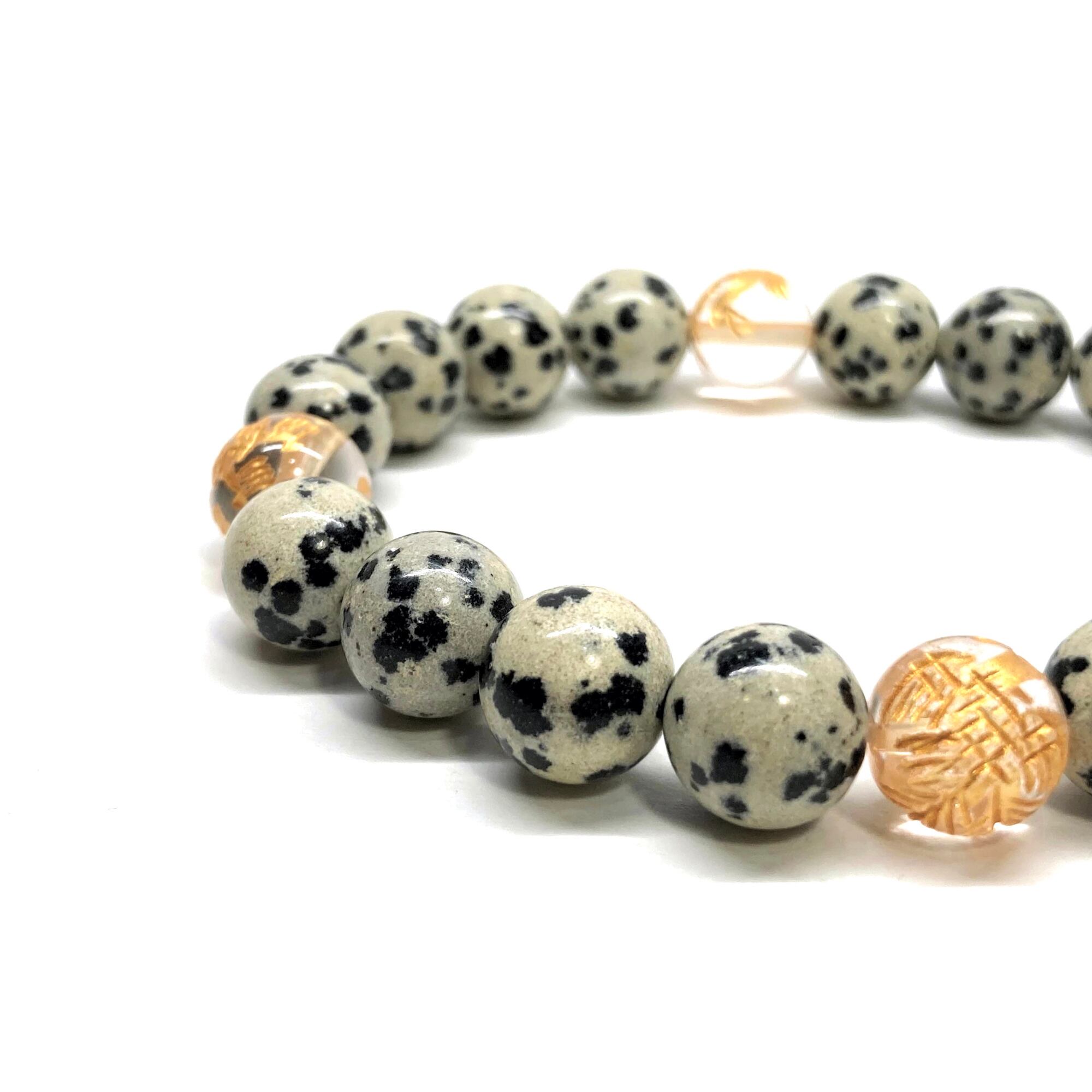 ご覧頂いているブレスレットは、四神獣金彫水晶とダルメシアンジャスパーを組み合わせたブレスレット。守り神である四神とパワーストーンの組み合わせで運気の流れを引き寄せる強運ブレスレットです。シンプルなデザインで男女問わず、年齢問わずご使用頂けるデザインなっております。シンプルなデザインは日常のアクセントとして、仕事やビジネスカジュアル、パーティーや特別なイベントなど様々なシーン活用できます。また、ちょっと贈り物にも最適なブレスレットになっております。四神獣を身につけて厄災から身を守り、多くの運気を呼び込まれてください。
