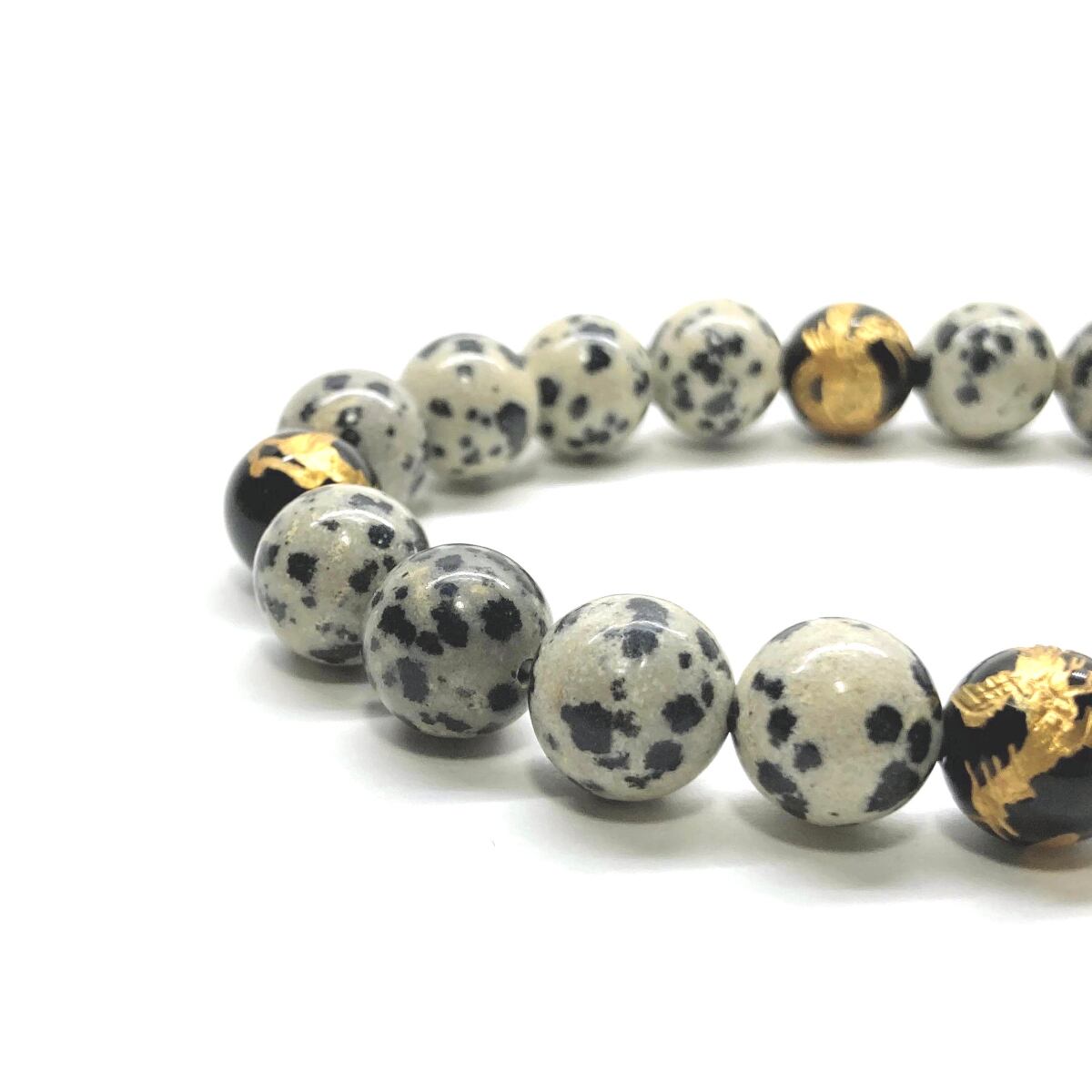 ご覧頂いているブレスレットは、四神獣金彫オニキスとダルメシアンジャスパーを組み合わせたブレスレット。守り神である四神とパワーストーンの組み合わせで運気の流れを引き寄せる強運ブレスレットです。シンプルなデザインで男女問わず、年齢問わずご使用頂けるデザインなっております。シンプルなデザインは日常のアクセントとして、仕事やビジネスカジュアル、パーティーや特別なイベントなど様々なシーン活用できます。また、ちょっと贈り物にも最適なブレスレットになっております。四神獣を身につけて厄災から身を守り、多くの運気を呼び込まれてください。