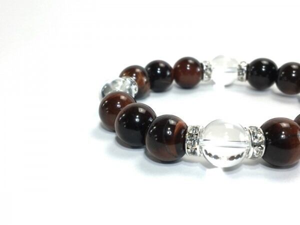 こちらは、12mm玉のレッドタイガーアイと水晶を使用した天然石ブレスレットです。石との間にはロンデルを挟み高級感を演出しています。シンプルなデザインですのでどんなコーディネートとも合わせ易いブレスレットです。石大きさは12mm玉です。内周約18cmです。気になる方は是非この機会にどうぞ。