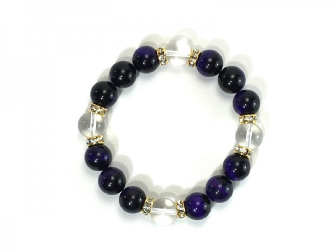 こちらは、12mm玉のパープルタイガーアイと水晶を使用した天然石ブレスレットです。石との間にはロンデルを挟み高級感を演出しています。シンプルなデザインですのでどんなコーディネートとも合わせ易いブレスレットです。石大きさは12mm玉です。内周約18cmです。気になる方は是非この機会にどうぞ。
