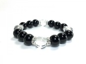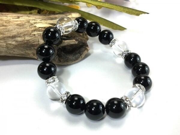 こちらは、12mm玉のオニキスと水晶を使用した天然石ブレスレットです。石との間にはロンデルを挟み高級感を演出しています。シンプルなデザインですのでどんなコーディネートとも合わせ易いブレスレットです。石大きさは12mm玉です。内周約18cmです。気になる方は是非この機会にどうぞ。