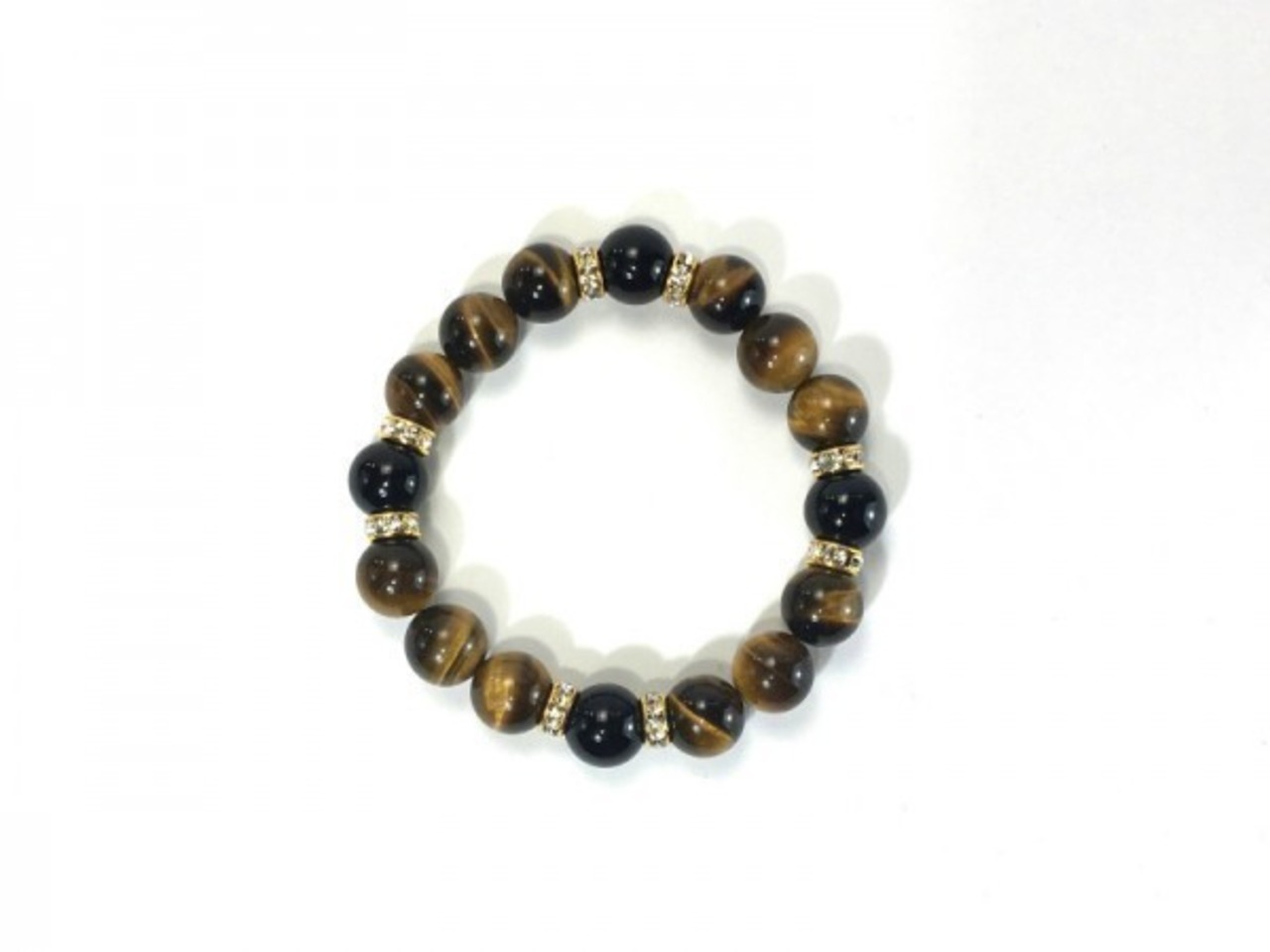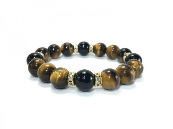 こちらは、12mm玉のタイガーアイとオニキスを使用した天然石ブレスレットです。石との間にはロンデルを挟み高級感を演出しています。シンプルなデザインですのでどんなコーディネートとも合わせ易いブレスレットです。石大きさは12mm玉です。内周約18cmです。気になる方は是非この機会にどうぞ。