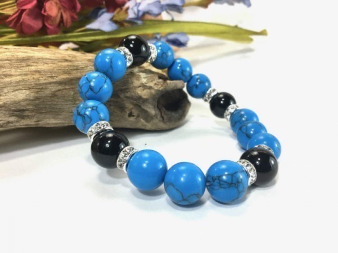 こちらは、12mm玉のターコイズとオニキスを使用したブレスレットです。石との間にはロンデルを挟み高級感を演出しています。シンプルなデザインですのでどんなコーディネートとも合わせ易いブレスレットです。石大きさは12mm玉です。内周約18cmです。気になる方は是非この機会にどうぞ。