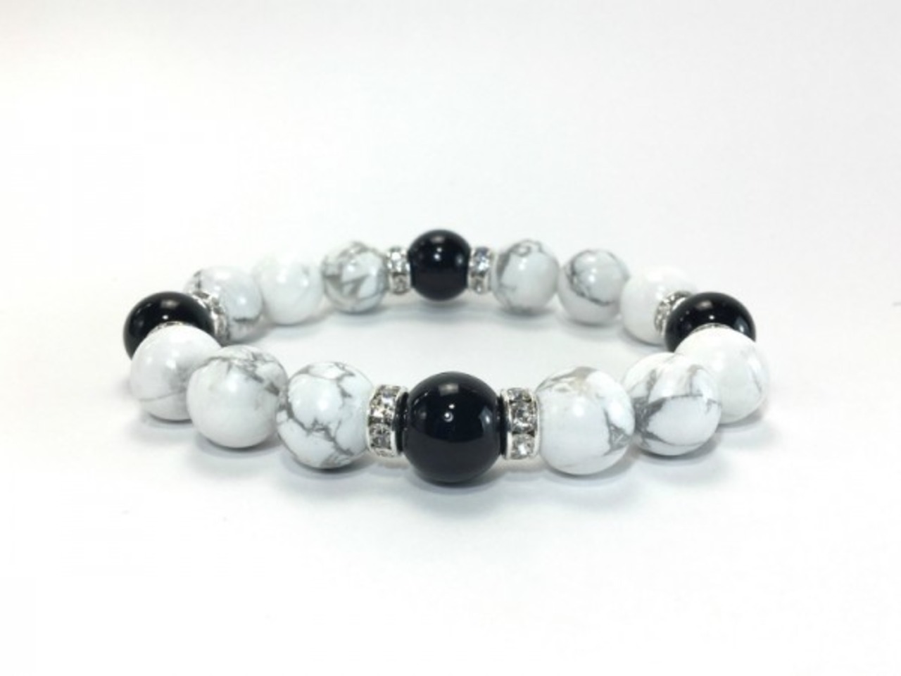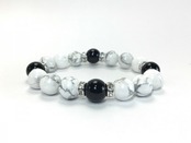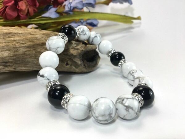 こちらは、12mm玉のハウライトとオニキスを使用した天然石ブレスレットです。石との間にはロンデルを挟み高級感を演出しています。シンプルなデザインですのでどんなコーディネートとも合わせ易いブレスレットです。石大きさは12mm玉です。内周約18cmです。気になる方は是非この機会にどうぞ。