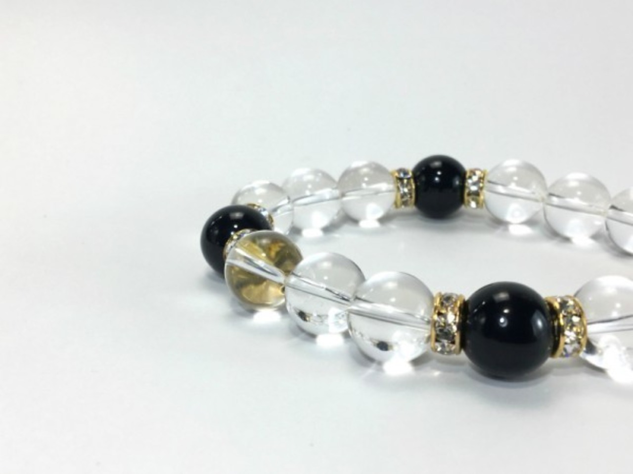 こちらは、12mm玉の水晶とオニキスを使用した天然石ブレスレットです。石との間にはロンデルを挟み高級感を演出しています。シンプルなデザインですのでどんなコーディネートとも合わせ易いブレスレットです。石大きさは12mm玉です。内周約18cmです。気になる方は是非この機会にどうぞ。