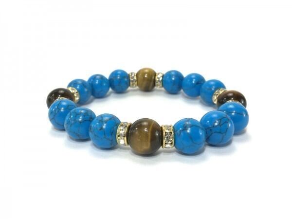 こちらは、12mm玉のターコイズとタイガーアイを使用したブレスレットです。石との間にはロンデルを挟み高級感を演出しています。シンプルなデザインですのでどんなコーディネートとも合わせ易いブレスレットです。石大きさは12mm玉です。内周約18cmです。気になる方は是非この機会にどうぞ。