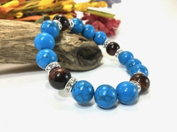 こちらは、12mm玉のターコイズとレッドタイガーアイを使用したブレスレットです。石との間にはロンデルを挟み高級感を演出しています。シンプルなデザインですのでどんなコーディネートとも合わせ易いブレスレットです。石大きさは12mm玉です。内周約18cmです。気になる方は是非この機会にどうぞ。
