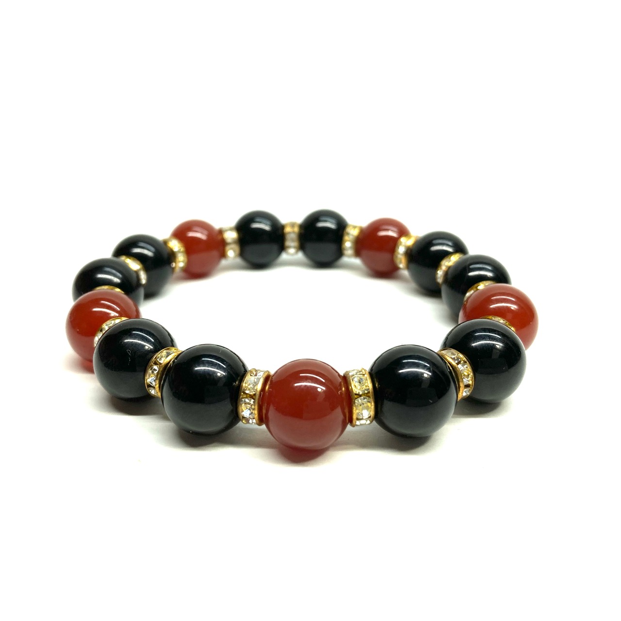こちらは、モリオンと赤瑪瑙を組み合わせたパワーストーンブレスレットです。間にはロンデルを挟み高級感あるデザインに仕上げております。石大きさは12mm玉を使用して内周 約18cmです。気になる方は是非この機会にどうぞ。