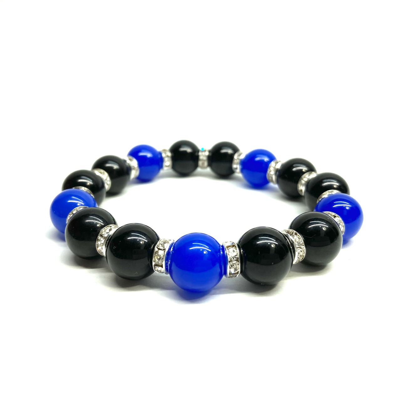 こちらは、モリオンと青瑪瑙を組み合わせたパワーストーンブレスレットです。間にはロンデルを挟み高級感あるデザインに仕上げております。石大きさは12mm玉を使用して内周 約18cmです。気になる方は是非この機会にどうぞ。