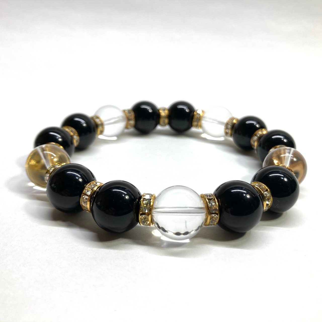 モリオン&水晶 パワーストーン ブレスレット 天然石ブレス (ゴールド) 12mm 幸運 開運 厄払い メンズ 男性 ☆