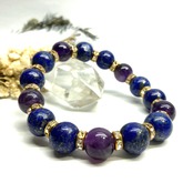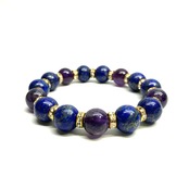 こちらは、ラピスラズリとアメジストを組み合わせたパワーストーンブレスレットです。間にはロンデルを挟み高級感あるデザインに仕上げております。石大きさは12mm玉を使用して内周 約18cmです。気になる方は是非この機会にどうぞ。