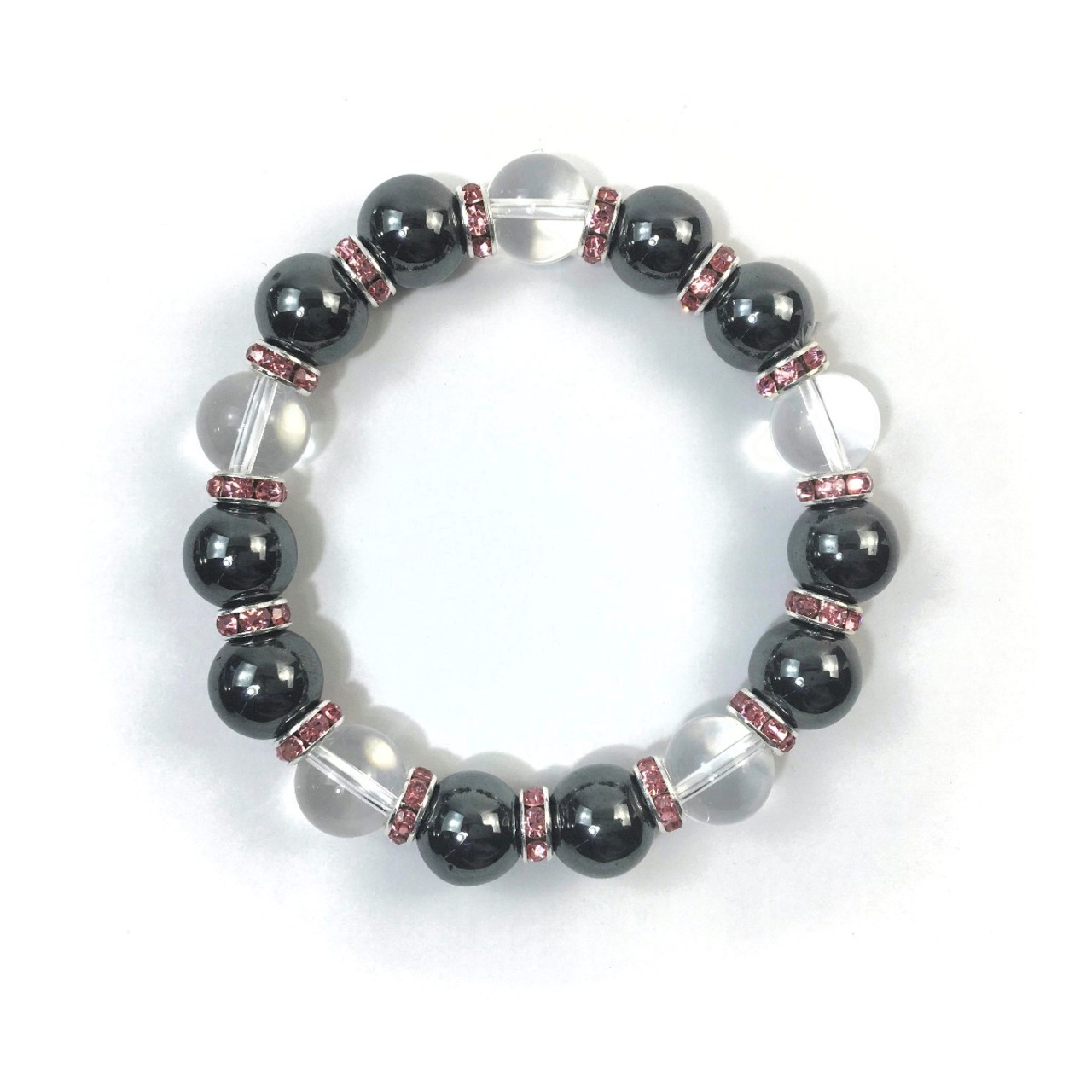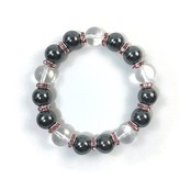 こちらは、ヘマタイトと水晶を組み合わせたパワーストーンブレスレットです。間にはロンデルを挟み高級感あるデザインに仕上げております。石大きさは12mm玉を使用して内周約18cmです。気になる方は是非この機会にどうぞ。