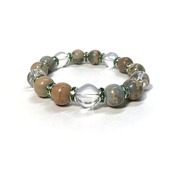 こちらは、インプレッションストーンと水晶を組み合わせたパワーストーンブレスレットです。間にはロンデルを挟み高級感あるデザインに仕上げております。石大きさは12mm玉を使用して内径約18cmです。気になる方は是非この機会にどうぞ。