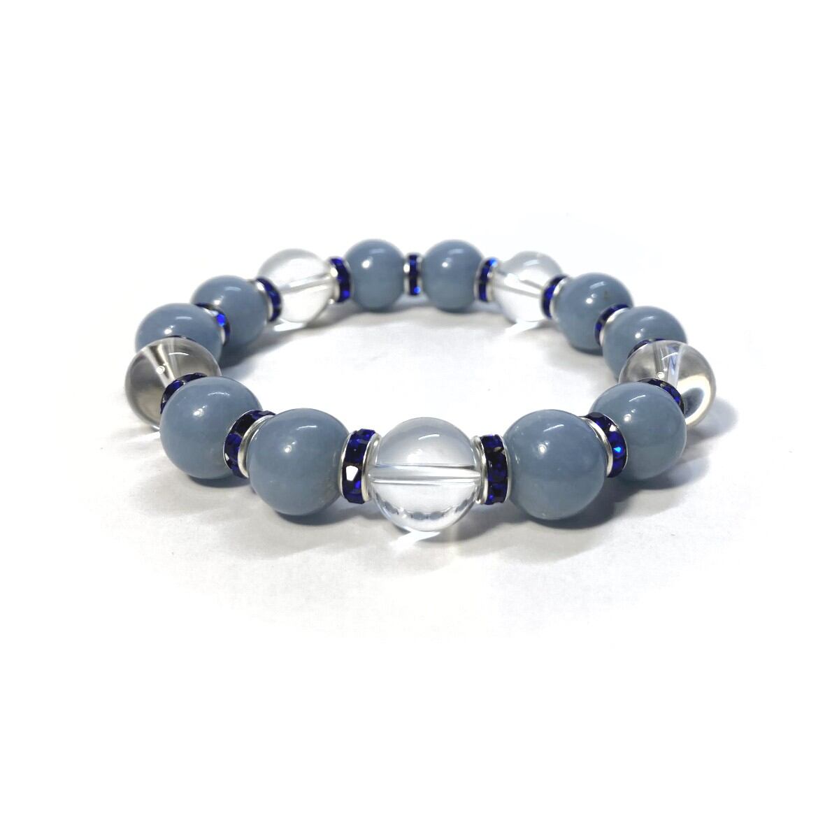 こちらは、エンジェライトと水晶を組み合わせたパワーストーンブレスレットです。間にはロンデルを挟み高級感あるデザインに仕上げております。石大きさは12mm玉を使用して内径約18cmです。気になる方は是非この機会にどうぞ。