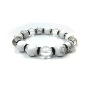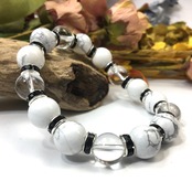こちらは、ハウライトと水晶を組み合わせたパワーストーンブレスレットです。間にはロンデルを挟み高級感あるデザインに仕上げております。石大きさは12mm玉を使用して内周約18cmです。気になる方は是非この機会にどうぞ。
