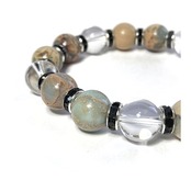 こちらは、インプレッションストーンと水晶を組み合わせたパワーストーンブレスレットです。間にはロンデルを挟み高級感あるデザインに仕上げております。石大きさは12mm玉を使用して内径約18cmです。気になる方は是非この機会にどうぞ。