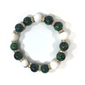 こちらは、グリーンタイガーアイとハウライトを組み合わせたパワーストーンブレスレットです。間にはロンデルを挟み高級感あるデザインに仕上げております。石大きさは12mm玉を使用して内周約18cmです。気になる方は是非この機会にどうぞ。