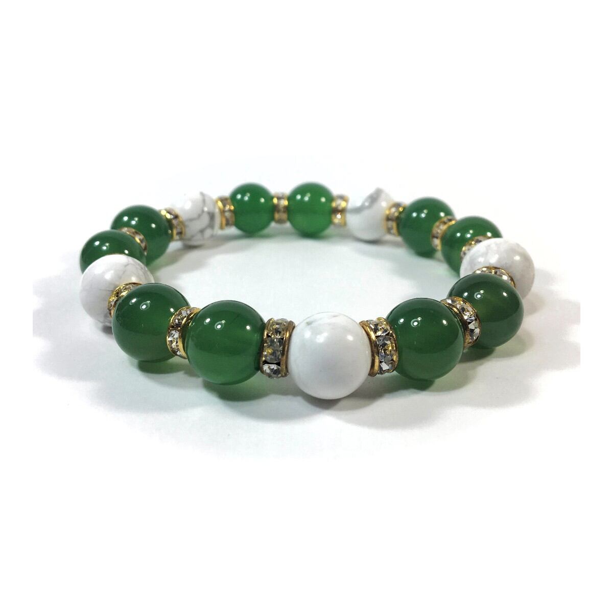 こちらは、緑瑪瑙とハウライトを組み合わせたパワーストーンブレスレットです。間にはロンデルを挟み高級感あるデザインに仕上げております。石大きさは12mm玉を使用して内周約18cmです。気になる方は是非この機会にどうぞ。