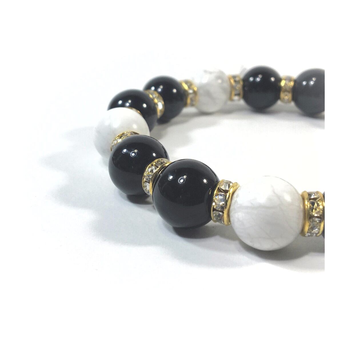 こちらは、オニキスとハウライトを組み合わせたパワーストーンブレスレットです。間にはロンデルを挟み高級感あるデザインに仕上げております。石大きさは12mm玉を使用して内周約18cmです。気になる方は是非この機会にどうぞ。
