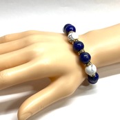 こちらは、ラピスラズリとハウライトを組み合わせたパワーストーンブレスレットです。間にはロンデルを挟み高級感あるデザインに仕上げております。程よくインパクトがある12mm玉を使用して内周約18cmです。数に限りがございますので気になる方はお早めにどうぞ。