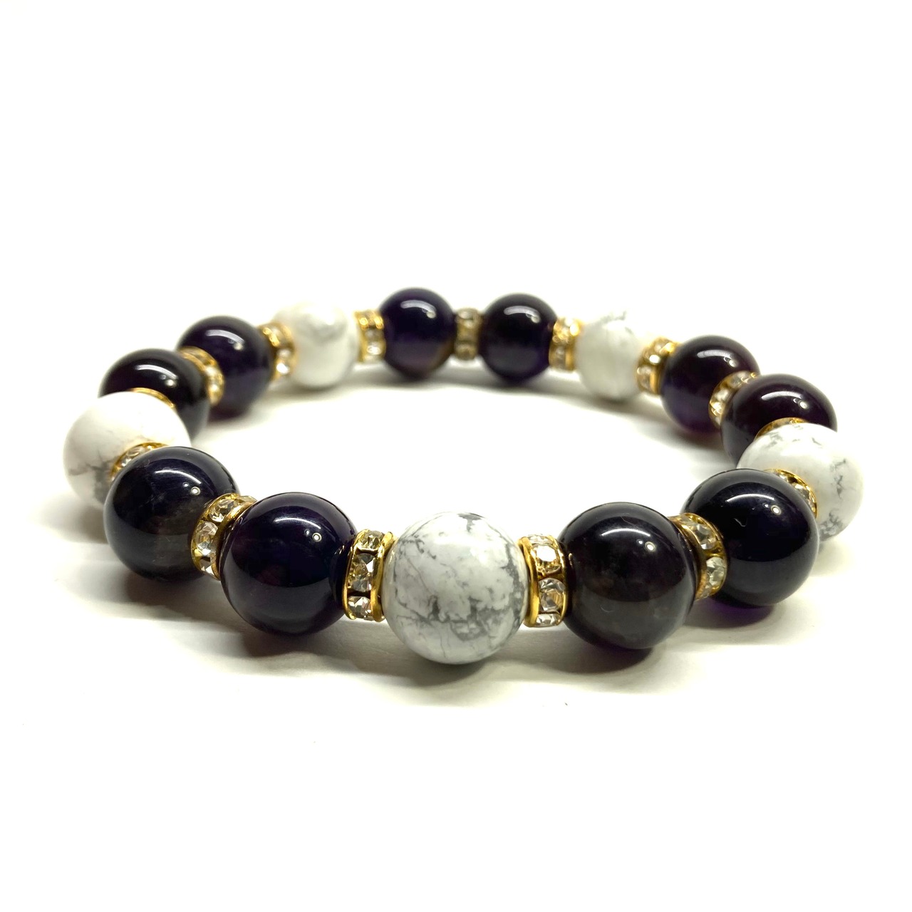 こちらは、12mm玉のアメジストとハウライトを組み合わせたパワーストーンブレスレットです。間にはロンデルを挟み高級感あるデザインに仕上げております。石大きさは12mm玉を使用して内周約18cmです。数に限りがございますので気になる方はお早めにどうぞ。
