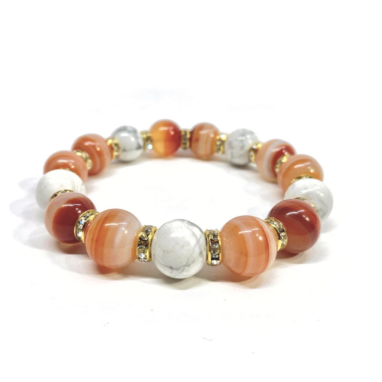 こちらは、12mm玉のカーネリアン・サードニクス(サードオニキス)とハウライトを組み合わせたパワーストーンブレスレットです。間にはロンデルを挟み高級感あるデザインに仕上げております。石大きさは12mm玉を使用して内周約18cmです。気になる方は是非この機会にどうぞ。