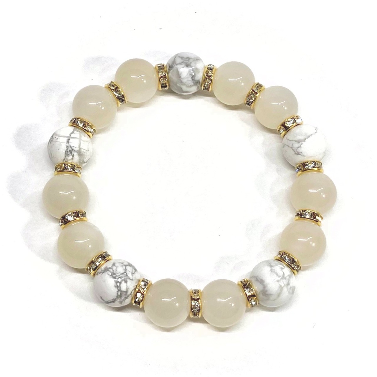 こちらは、12mm玉のムーンストーンとハウライトを組み合わせたパワーストーンブレスレットです。間にはロンデルを挟み高級感あるデザインに仕上げております。石大きさは12mm玉を使用して内周約18cmです。気になる方は是非この機会にどうぞ。