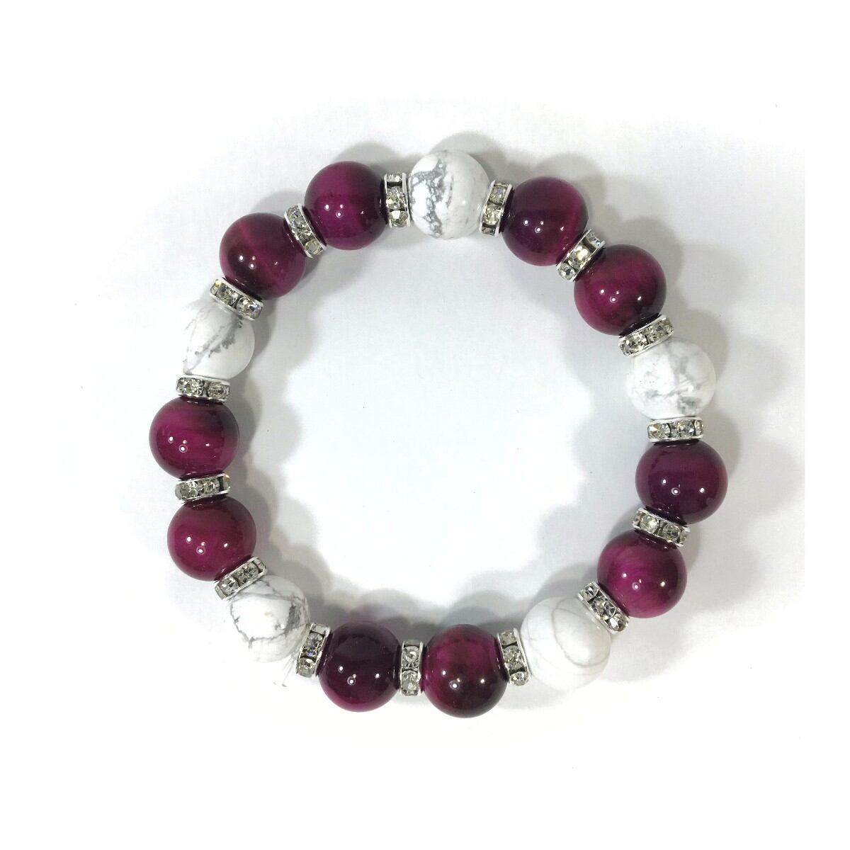 こちらは、ピンクタイガーアイとハウライトを組み合わせたパワーストーンブレスレットです。間にはロンデルを挟み高級感あるデザインに仕上げております。石大きさは12mm玉を使用して内周約18cmです。気になる方は是非この機会にどうぞ。