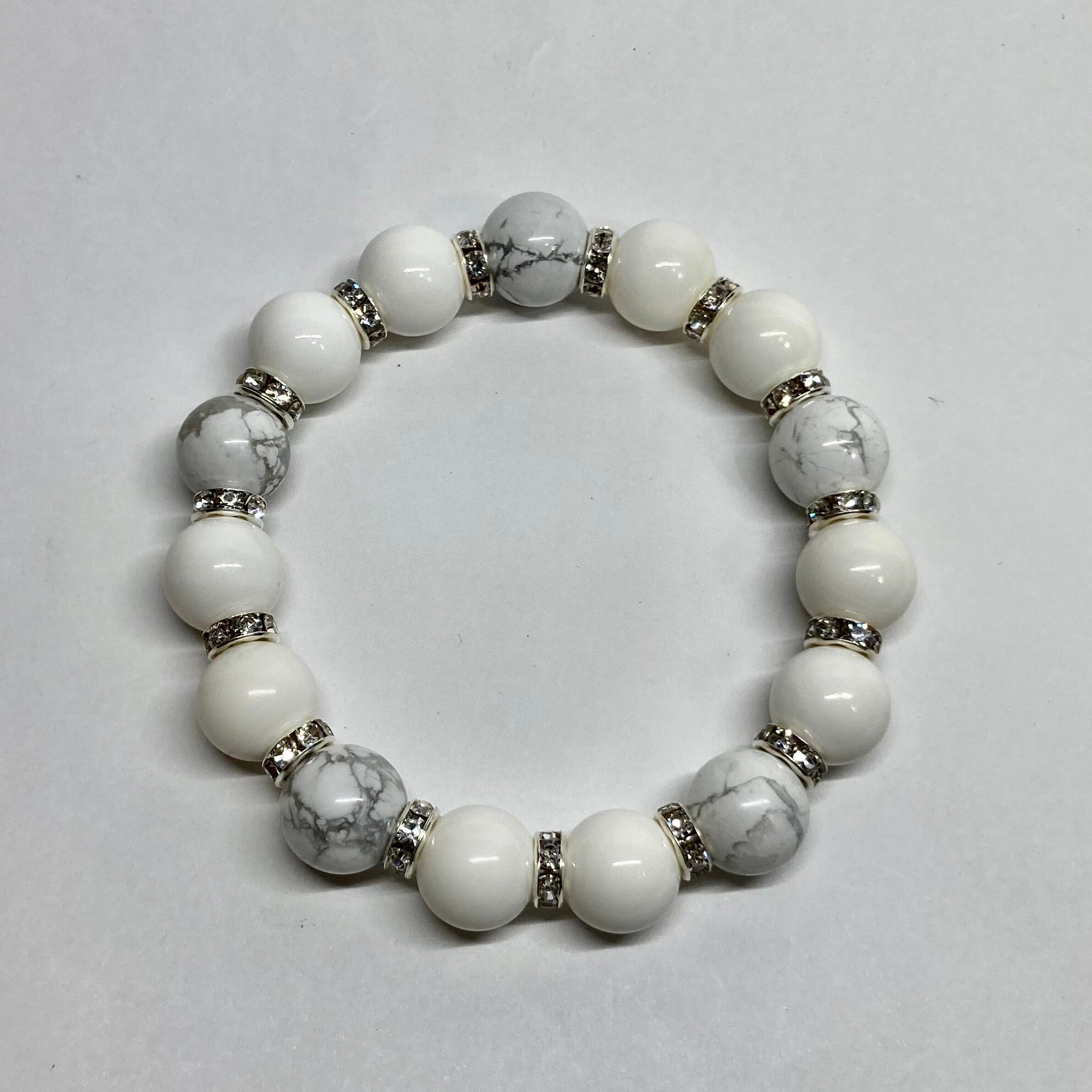 こちらは、ホワイトオニキスとハウライトを組み合わせたパワーストーンブレスレットです。間にはロンデルを挟み高級感あるデザインに仕上げております。程よくインパクトがある12mm玉を使用して内周約18cmです。数に限りがございますので気になる方はお早めにどうぞ。