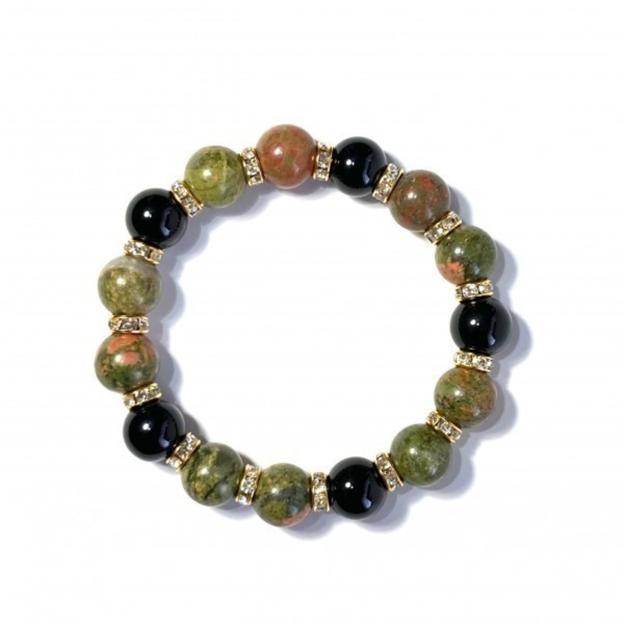 こちらは、ユナカイトとオニキスを組み合わせたパワーストーンブレスレットです。間にはロンデルを挟み高級感あるデザインに仕上げております。石大きさは12mm玉を使用して内径約18cmです。気になる方は是非この機会にどうぞ。