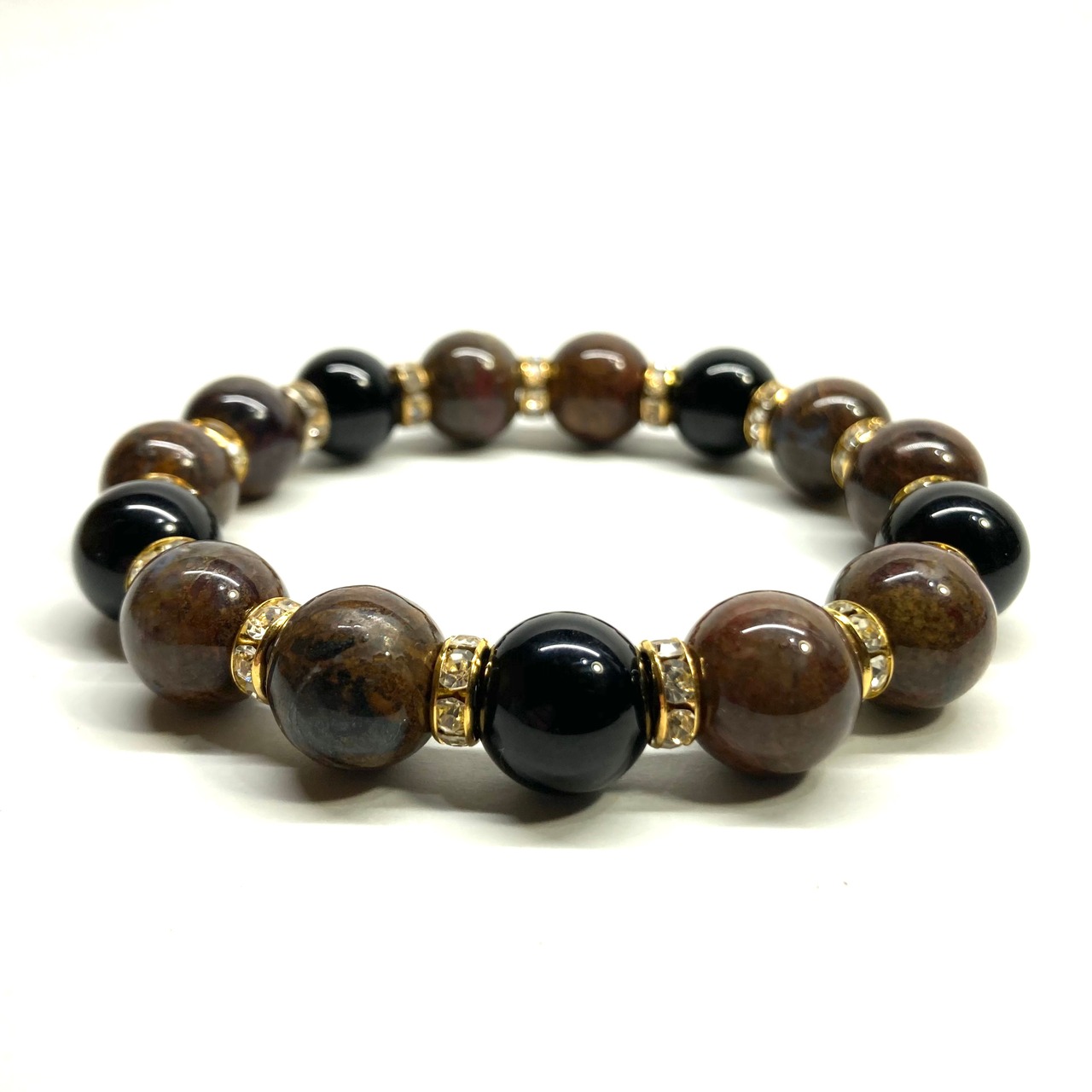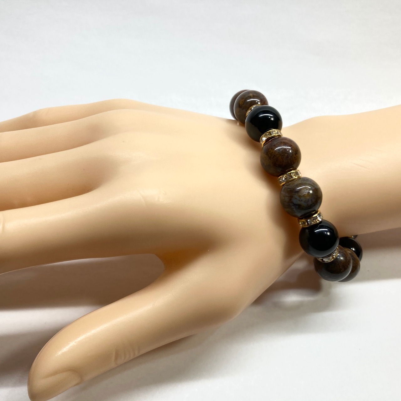 こちらは、10mm玉のピーターサイトとオニキスを組み合わせたパワーストーンブレスレットです。間にはロンデルを挟み高級感あるデザインに仕上げております。石大きさは12mm玉を使用して内径約18cmです。数に限りがございますので気になる方はお早めにどうぞ。