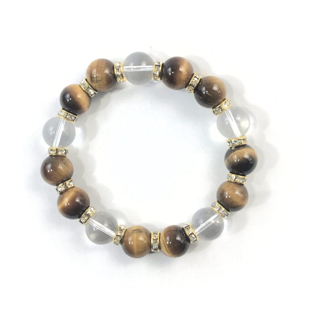 こちらは、タイガーアイと水晶を組み合わせたパワーストーンブレスレットです。間にはロンデルを挟み高級感あるデザインに仕上げております。石大きさは12mm玉を使用して内周約18cmです。気になる方は是非この機会にどうぞ。