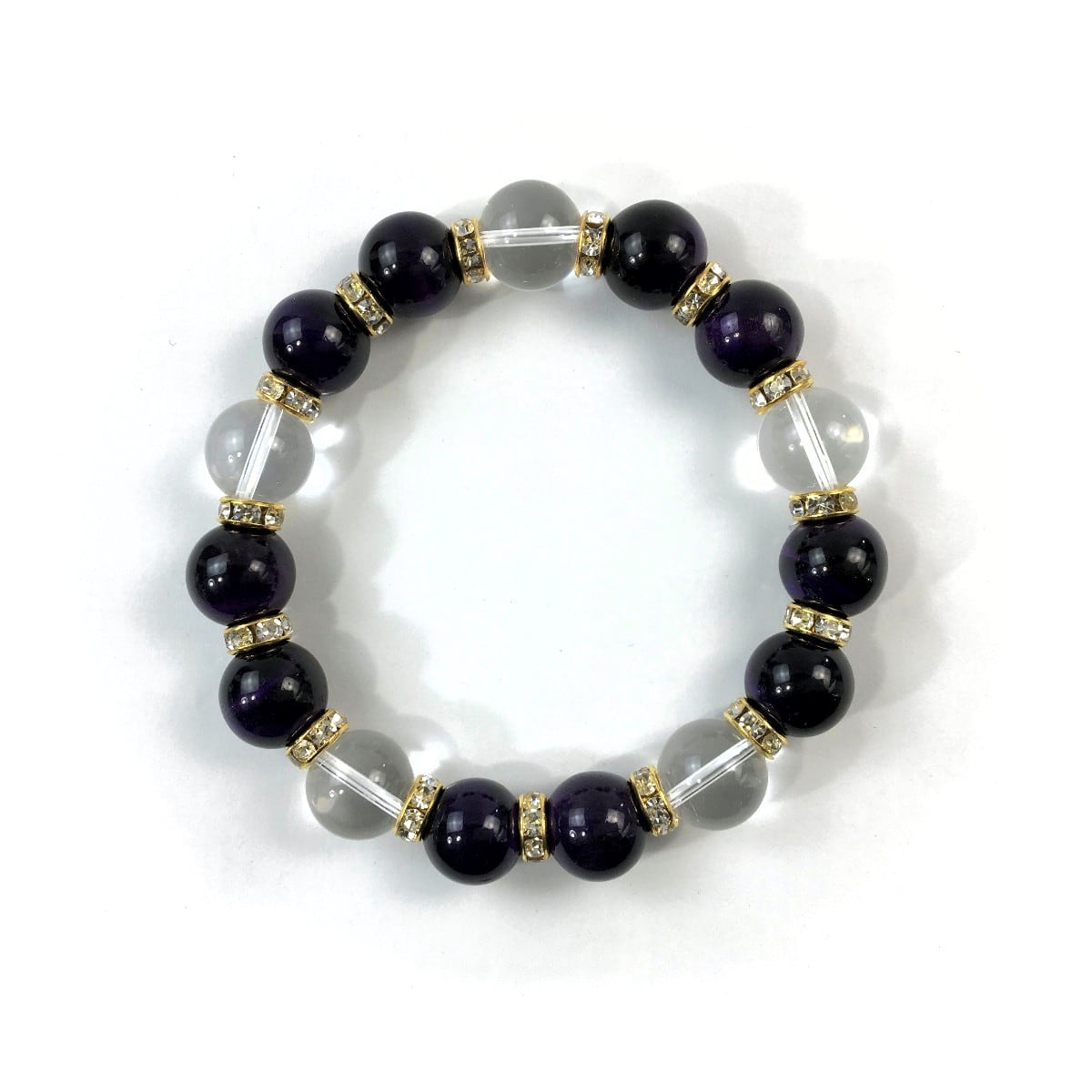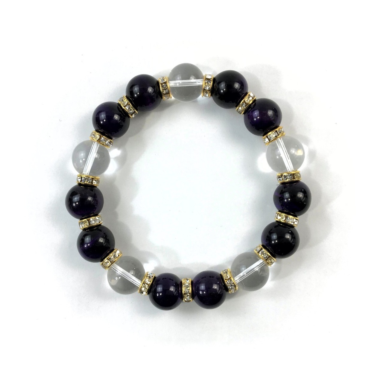 こちらは、パープルタイガーアイと水晶を組み合わせたパワーストーンブレスレットです。間にはロンデルを挟み高級感あるデザインに仕上げております。石大きさは12mm玉を使用して内周約18cmです。気になる方は是非この機会にどうぞ。