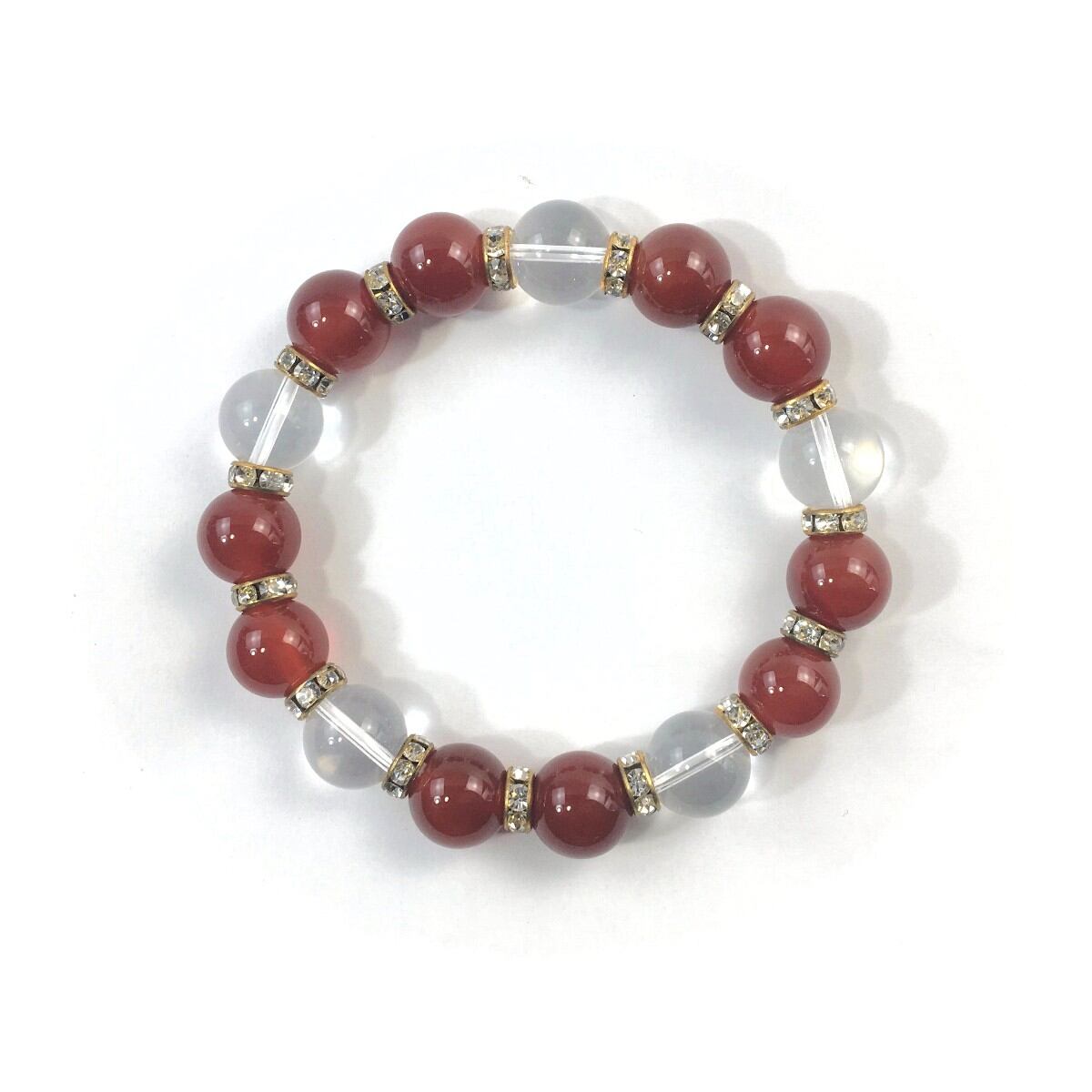 こちらは、赤瑪瑙と水晶を組み合わせたパワーストーンブレスレットです。間にはロンデルを挟み高級感あるデザインに仕上げております。石大きさは12mm玉を使用して内周約18cmです。気になる方は是非この機会にどうぞ。