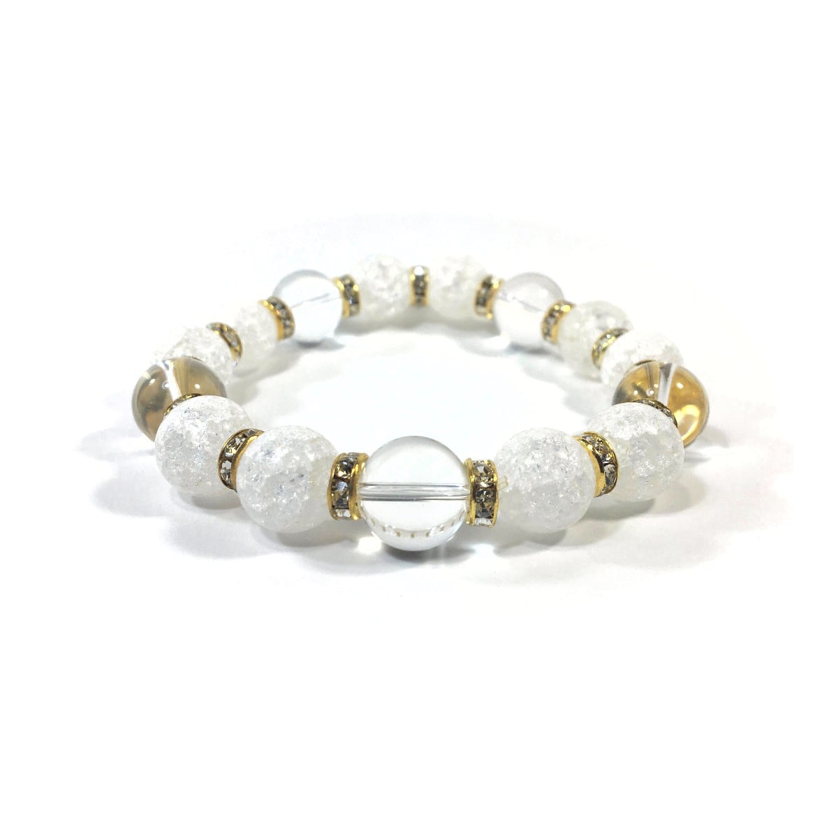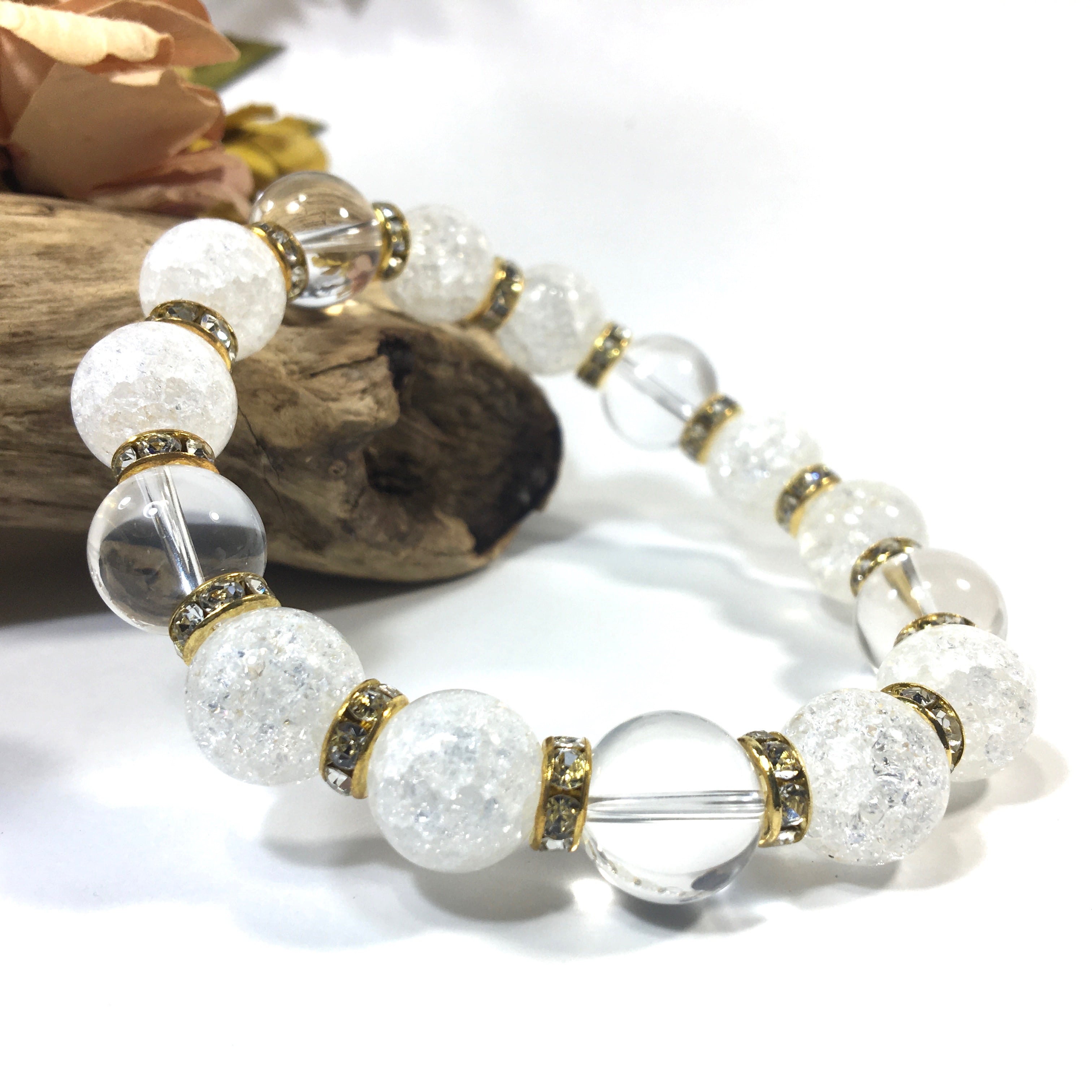 こちらは、クラック水晶と水晶を組み合わせたパワーストーンブレスレットです。間にはロンデルを挟み高級感あるデザインに仕上げております。石大きさは12mm玉を使用して内周約18cmです。気になる方は是非この機会にどうぞ。